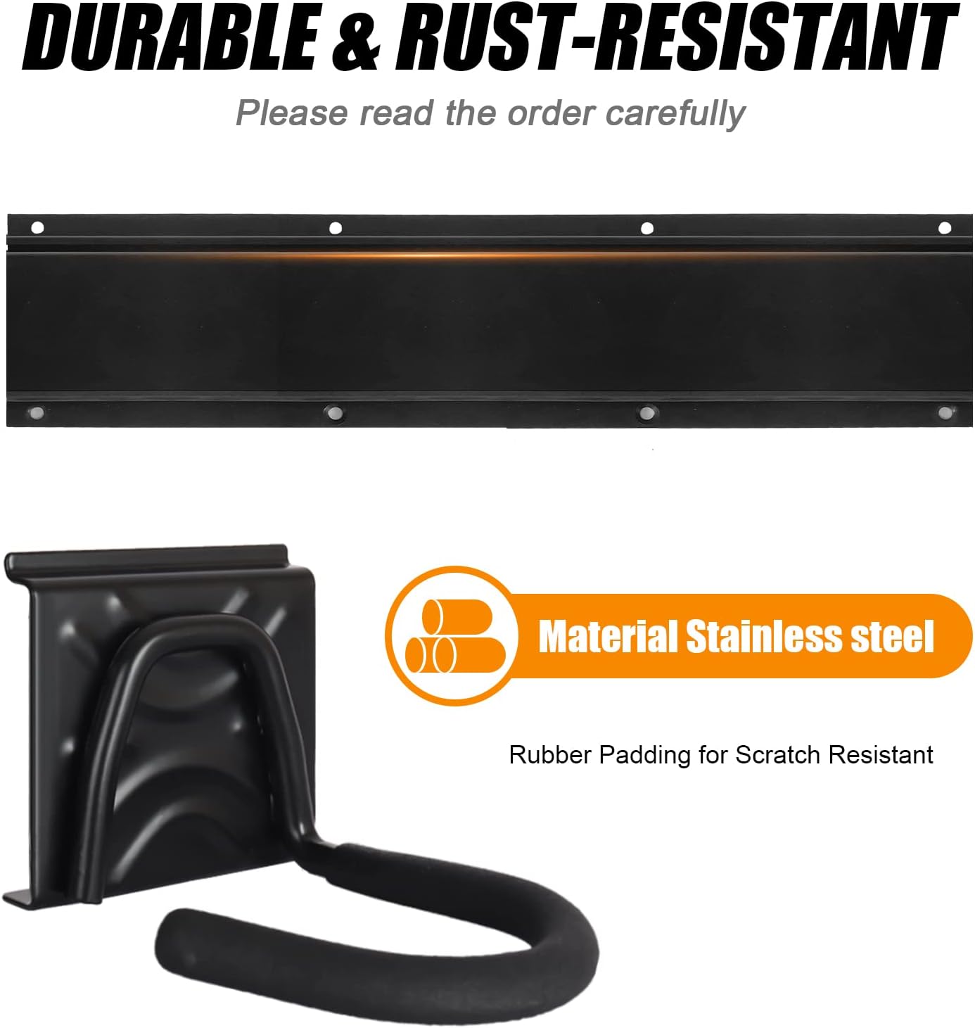 - SPECIFICATION - Our wall mount bike storage rack includes 2 tracks (16 inches each), 4 bike hooks, 2 helmet hooks, and mounting bolts for wood, drywall, and concrete walls