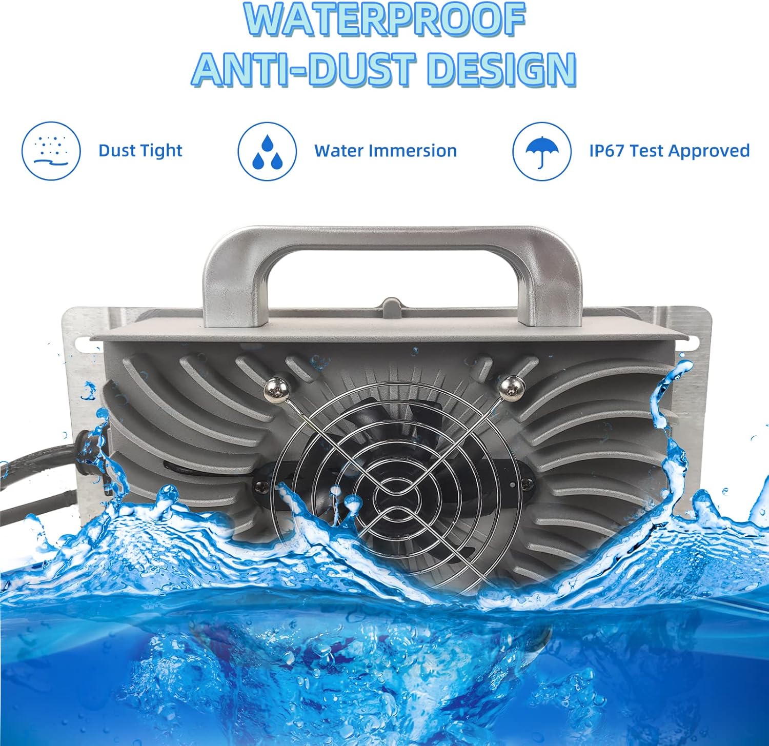 - 【PORTABLE & LIGHT WEIGHT DESIGN】 - Designed with convenience in mind, the waterproof charger weighs in at only 9 lbs,the light weight charger can easily be taken with you. It is constructed with a durable die-cast aluminum alloy casing providing exceptional durability.