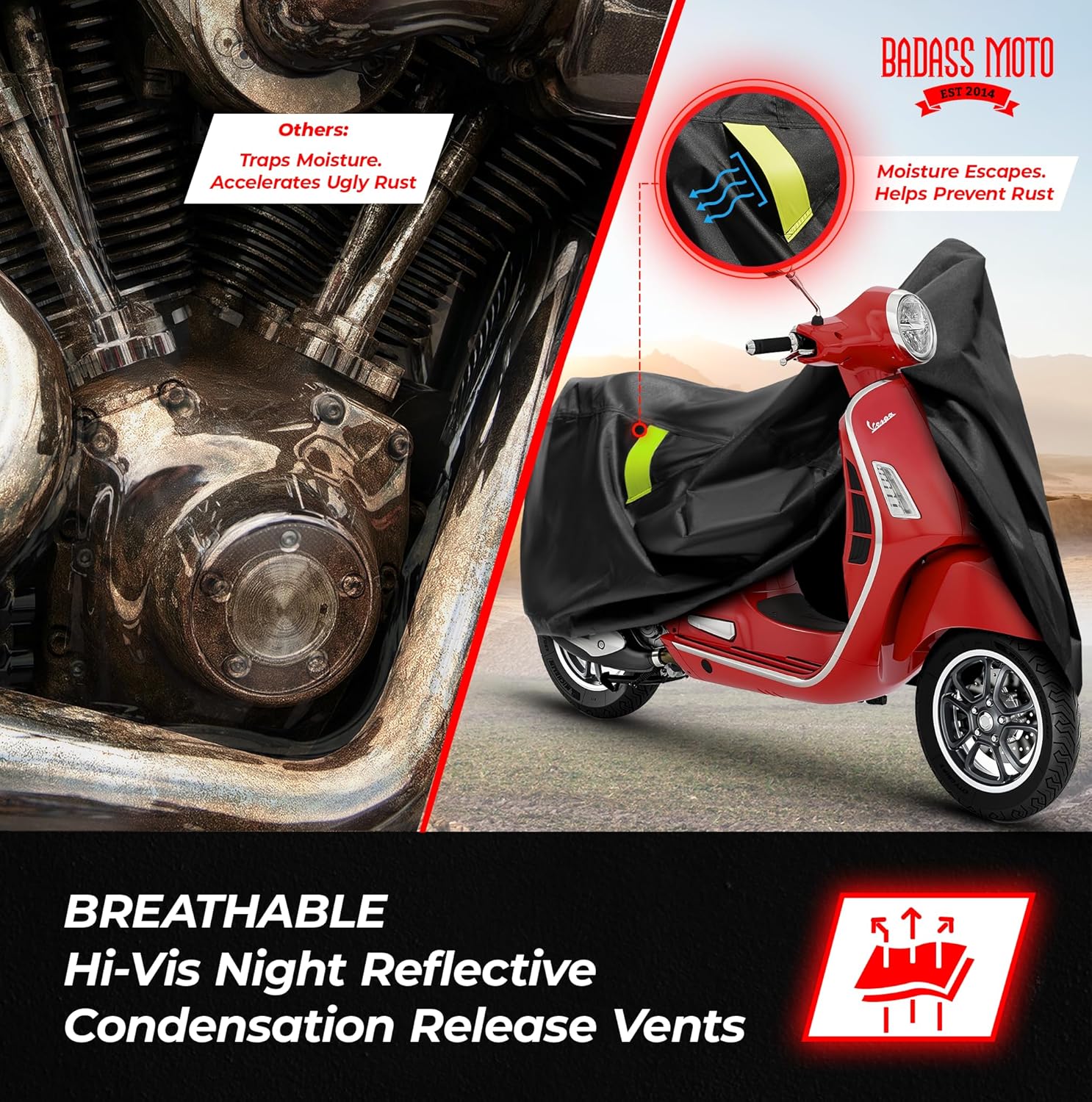 - EXTEND YOUR SCOOTER’S LIFE – By protecting your scooter from harsh weather, the Badass Moto Ultimate Scooter Cover helps you avoid costly repairs and frequent cleanings. This means you spend less time worrying about the condition of your scooter and more time enjoying the ride. It's a cost-effective way to keep your scooter looking and running like new. Great for honda scooter, moped cover waterproof outdoor, and outdoor motorcycle cover.