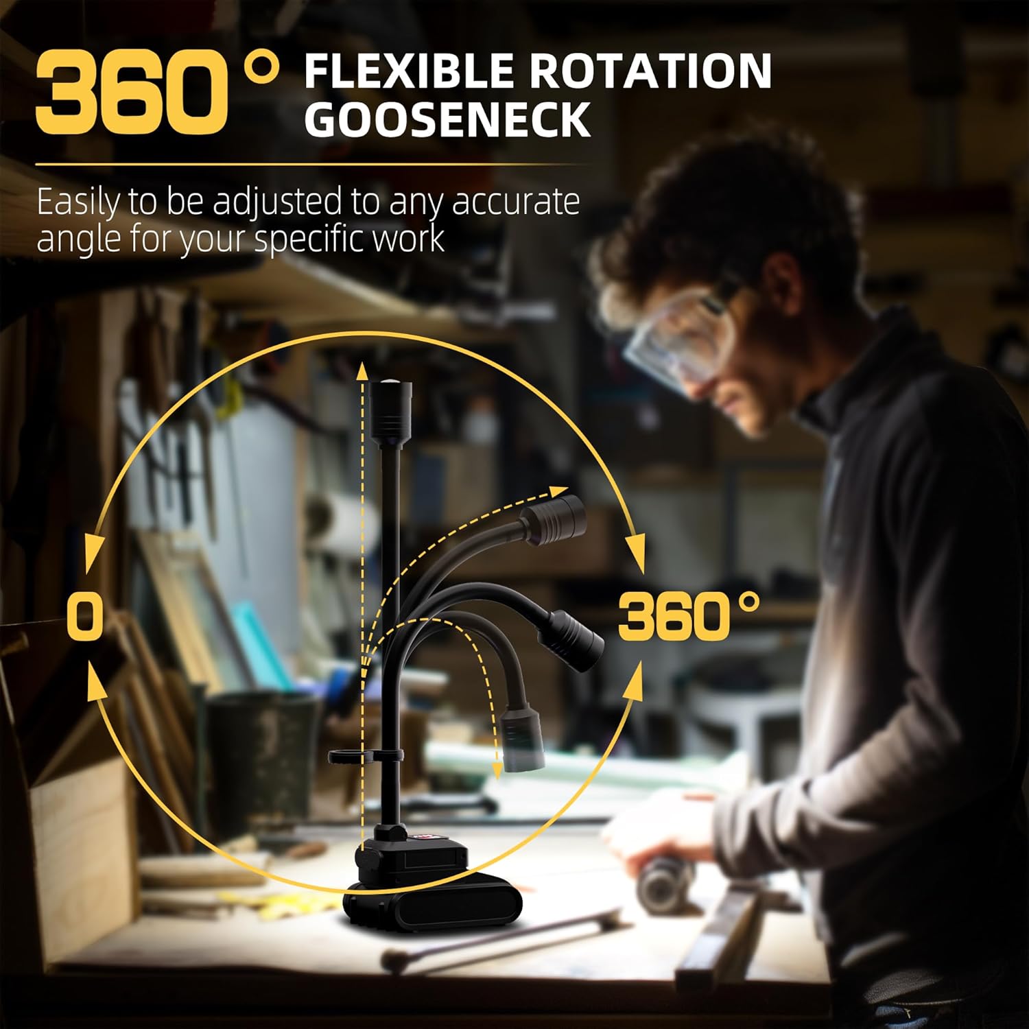 • 【360°Flexible Gooseneck】The gooseneck LED work light features an adjustable angle for various situations, providing wide-area illumination ideal for automotive and shop use. The work flashlight enables you to precisely illuminate deep, narrow, and curved spaces in detail, such as in CNC shops, without springing back or sagging. The folding work light is easy to carry and saves storage space when camping.