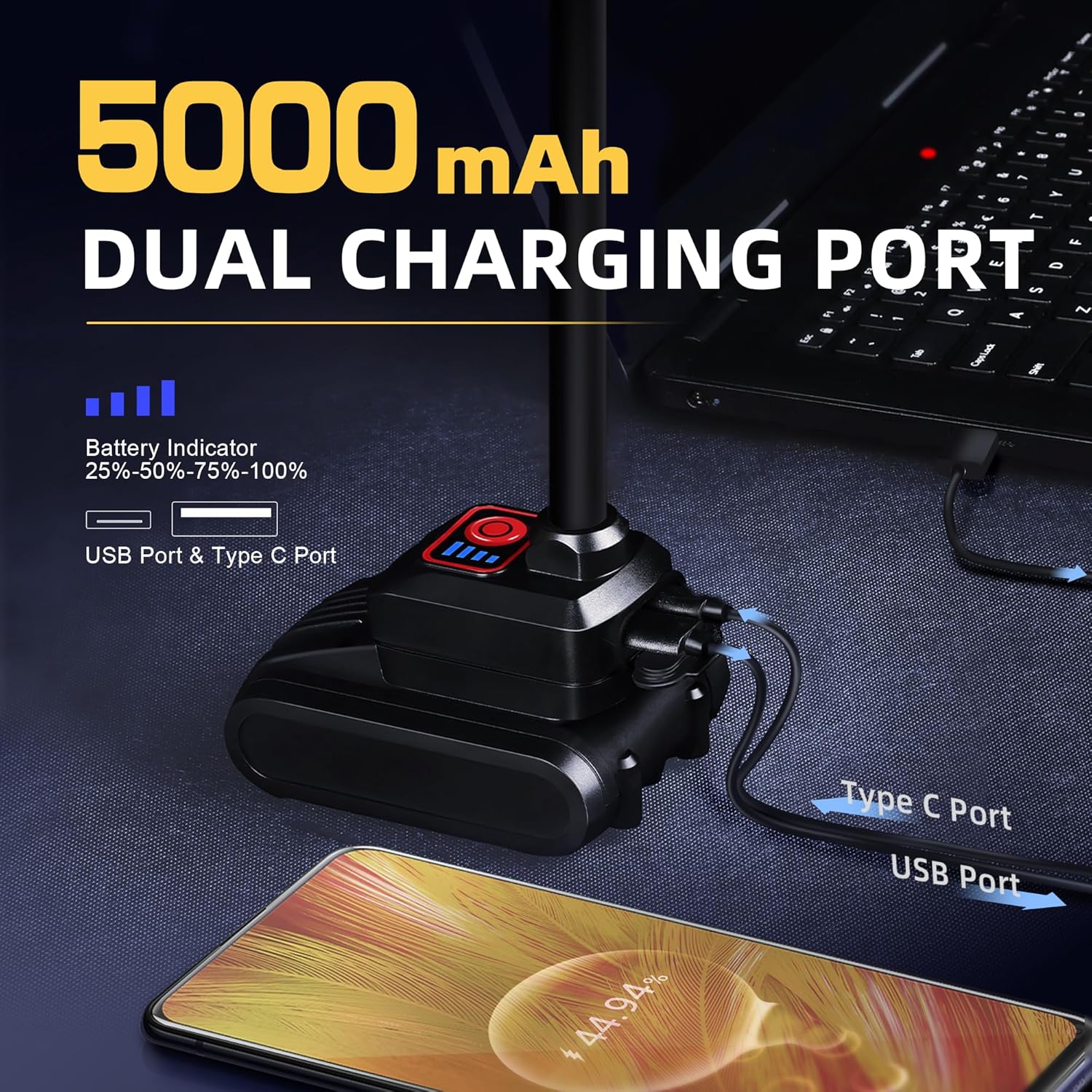 • 【5000mAh Battery & Portable Charger】The rechargeable work light is compatible with PD30W-65W fast charge, featuring a USB-C port to recharge the built-in 5000mAh battery and USB-A ports to charge phones or other small electronic devices when outlets are unavailable. It can last for 18 hours in low brightness and 5 hours in high brightness. Charging time is only 5–5.5 hours (5V, 2A Type-C). The built-in power indicator makes it easy to to check the remaining battery power in the event of a power outage.