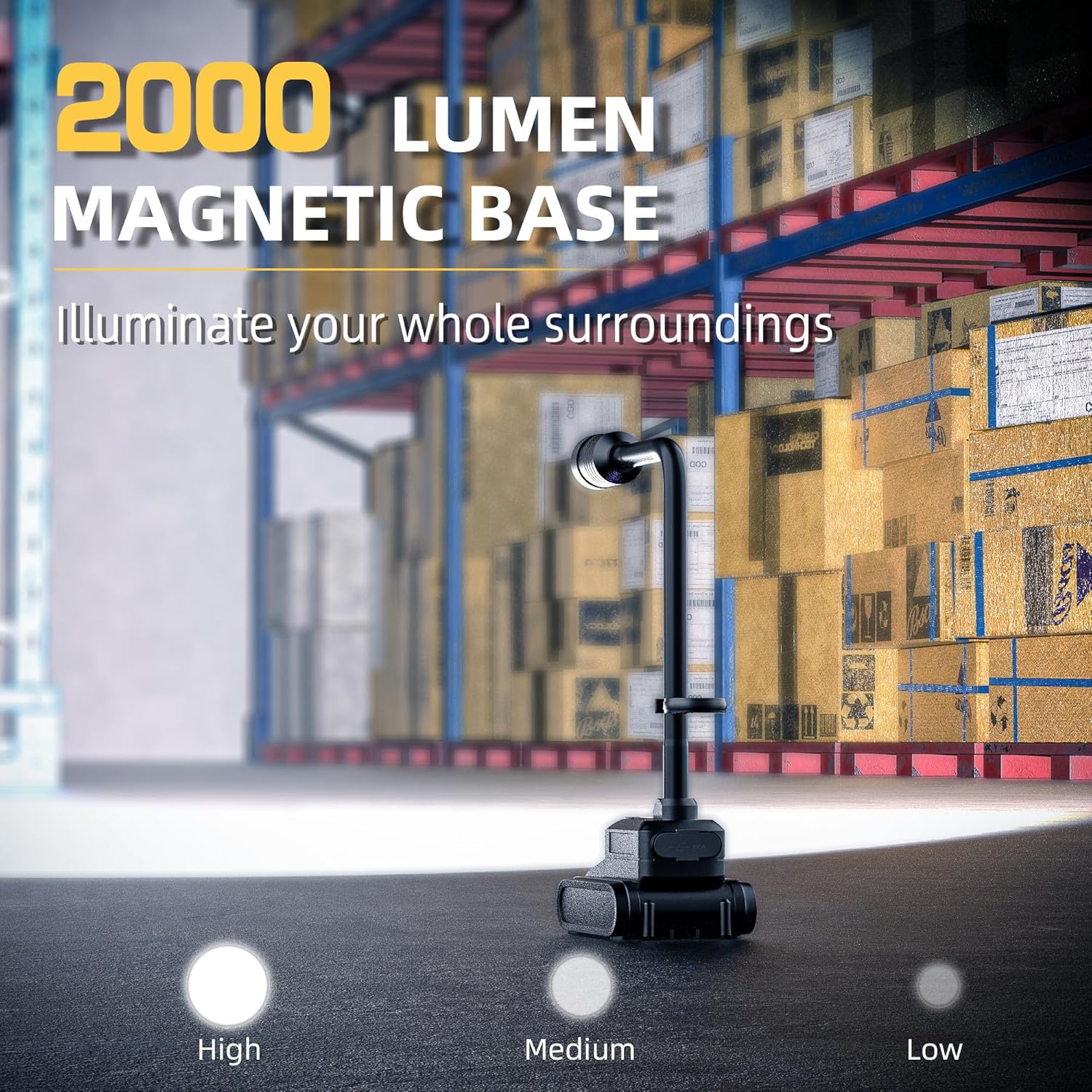 • 【2000Lumens Ultra-Bright & Adiustable】The 20W LED work light delivers up to 2000 lumens and 6500K white light (eye-caring, no glare, no flicker, or dimming during use). The flexible work light effectively illuminates dark corners of workbenches and lasts longer than traditional lights. Our mechanic light has three adjustable brightness modes—High, Medium, and Low—perfect for various tasks during low-light conditions.