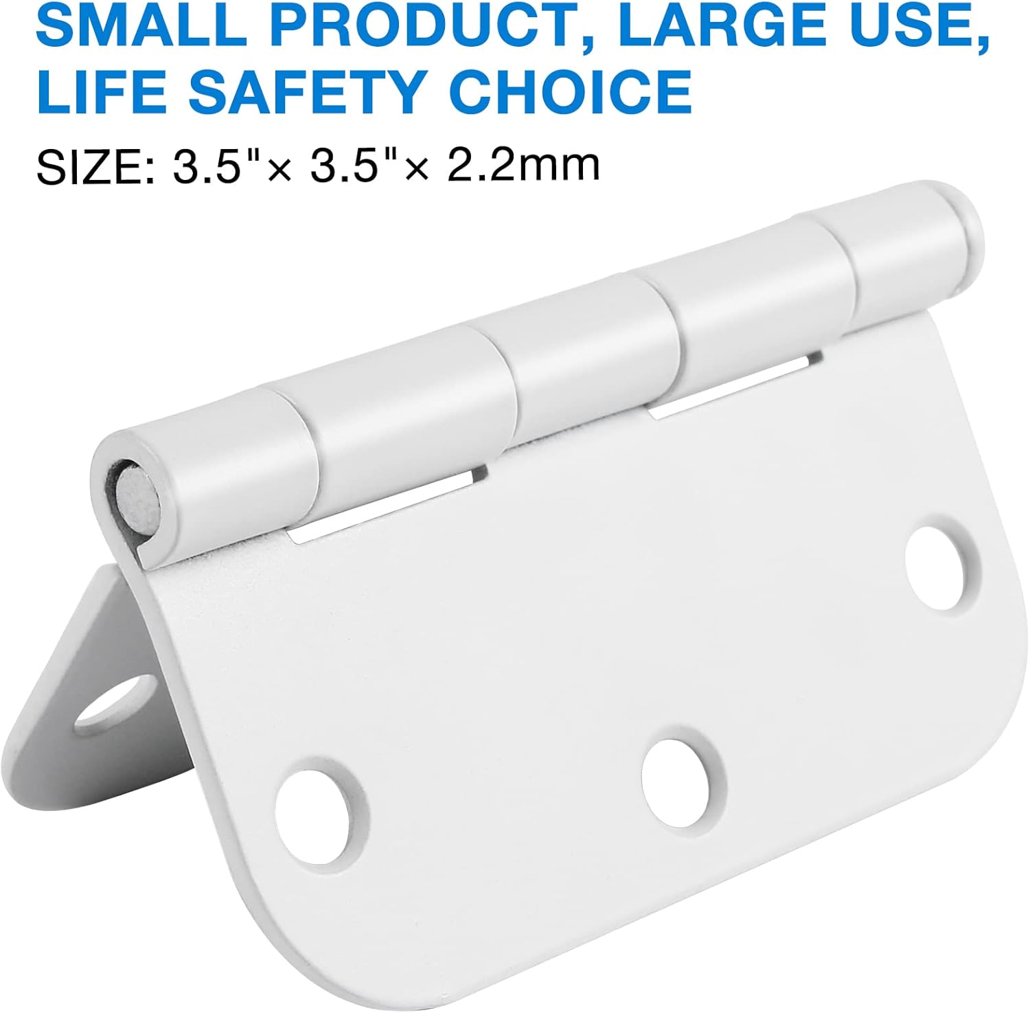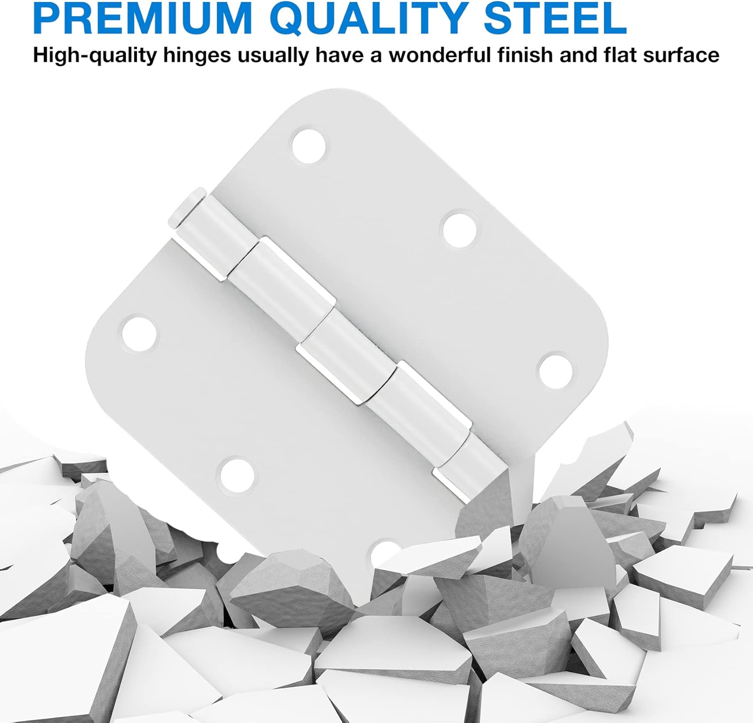 - 3.5 inch door hinges white with 5/8 rounded corner and 6 holes for front door, cabinet, wooden box. Indoor door hinge white Includes 36 free short screws and 6 extra long screws for quick and easy installation. White door hinges can be rotated 270 degrees.
