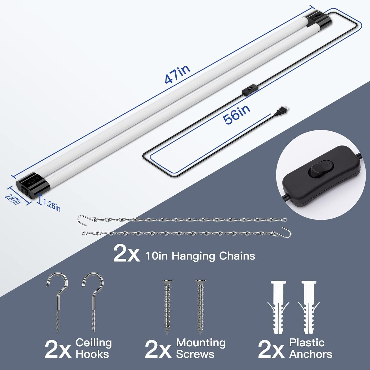 - Simple installation: Follow our installation guide for a quick and easy setup with included mounting hardware (56in Power Cord with Plug)! Directly mount to the ceiling or suspend from the ceiling for instant bright shop light in your garages, basements, warehouses, and storage area.