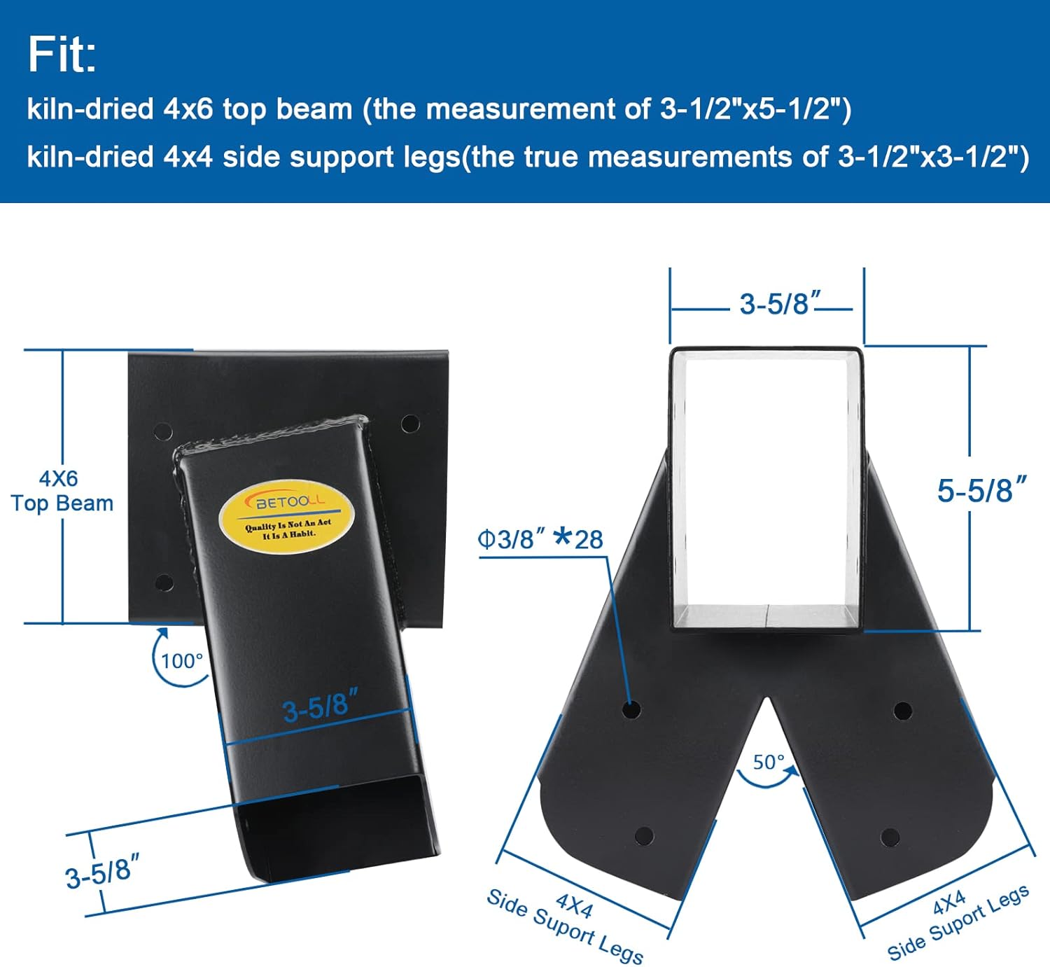 - Easy to install: Secure the swing brackets to the 4x6 top beam first. Then simply slide the 4x4 legs into the bracket with the beam flat on the ground (top down). Pre-drill holes for the lag screws and tighten them. Additionally, you can add a 2x4 crossbeam to the legs for added stability