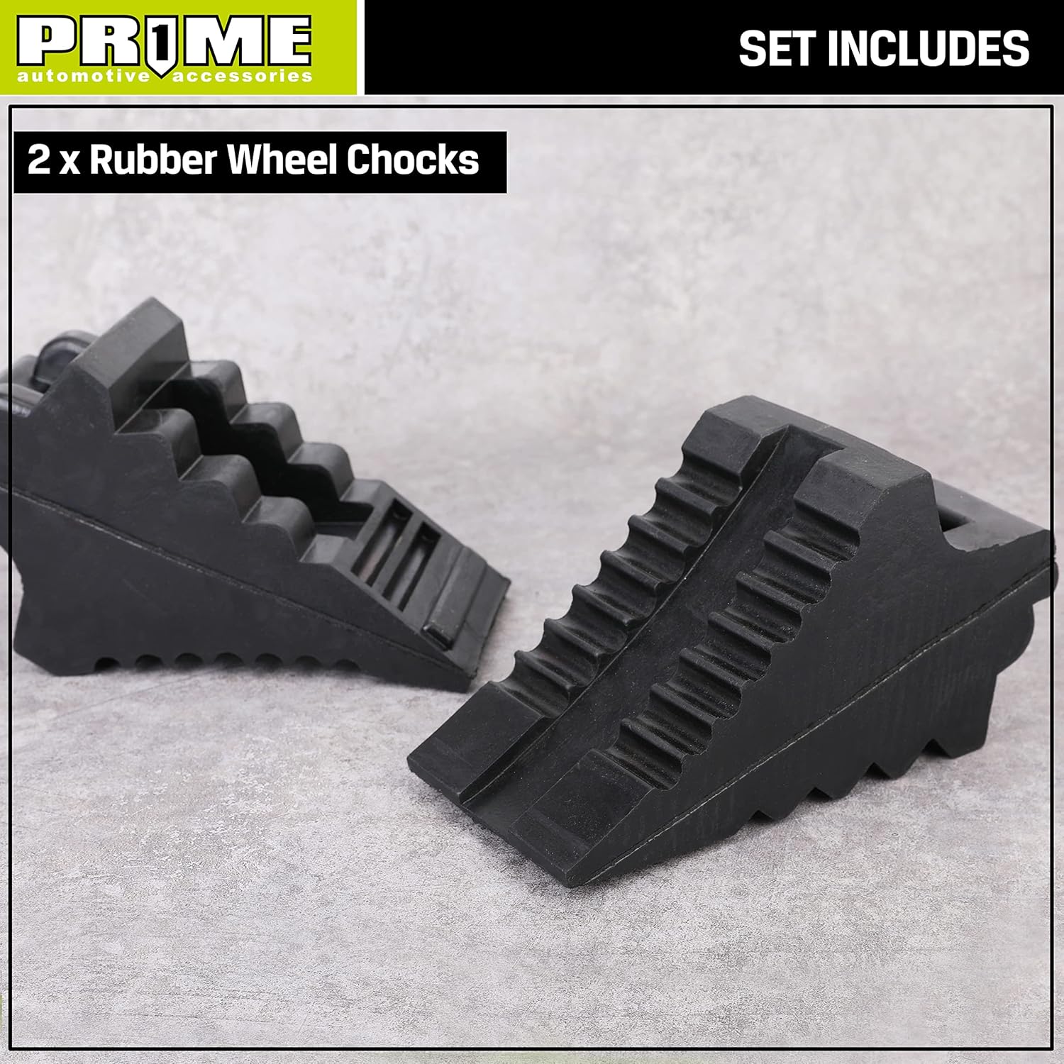 PR1ME Heavy Duty Rubber Wheel Chocks, Rubber Tire Blocks, RV Solid Rubber Wheel Wedge Blocks, 2 Pack Black 8.6" x 3.7" x 4.7", Carrying Handle, for Travel Trailer, Camper, RV, Truck