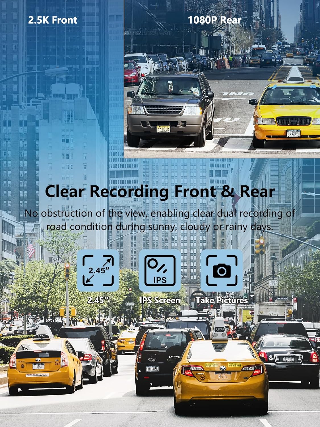 - 2.5K MINI DASH CAM FRONT AND REAR - ⭐The NEW VERSION has been updated since January 25, 2025. The resolution has been upgraded for a better experience. It comes with a 170 wide-angle 2.5K front camera and a 1080P HD waterproof rear camera that captures all three lanes of the road. This mini and compact dash cam won't obscure your view. Meanwhile, the IPS display and WDR function make video recording more vivid, colorful and clear.