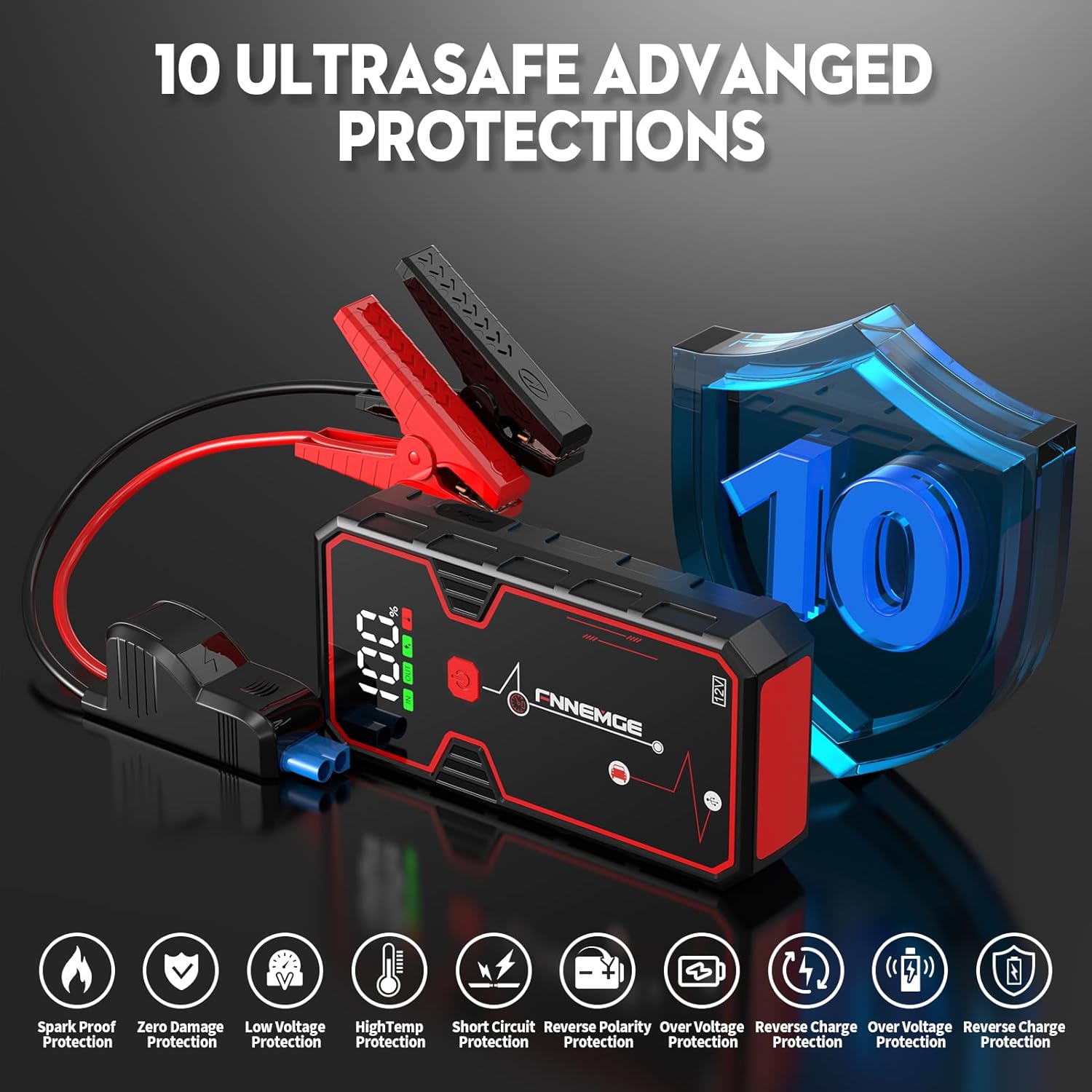 - 🚗 【WHAT YOU GET & WARRANTY】The FNNEMGE jump starter pack includes: 1 portable jump starter, 1 set of smart jumper cables, 1 USB-C charging cable, 1 storage box, and 1 user manual. We offer a 2-YEAR WARRANTY, Lifetime Technical Support, and Customer Service. If you have any questions during use, please reach out to us via the email address provided in the user manual.