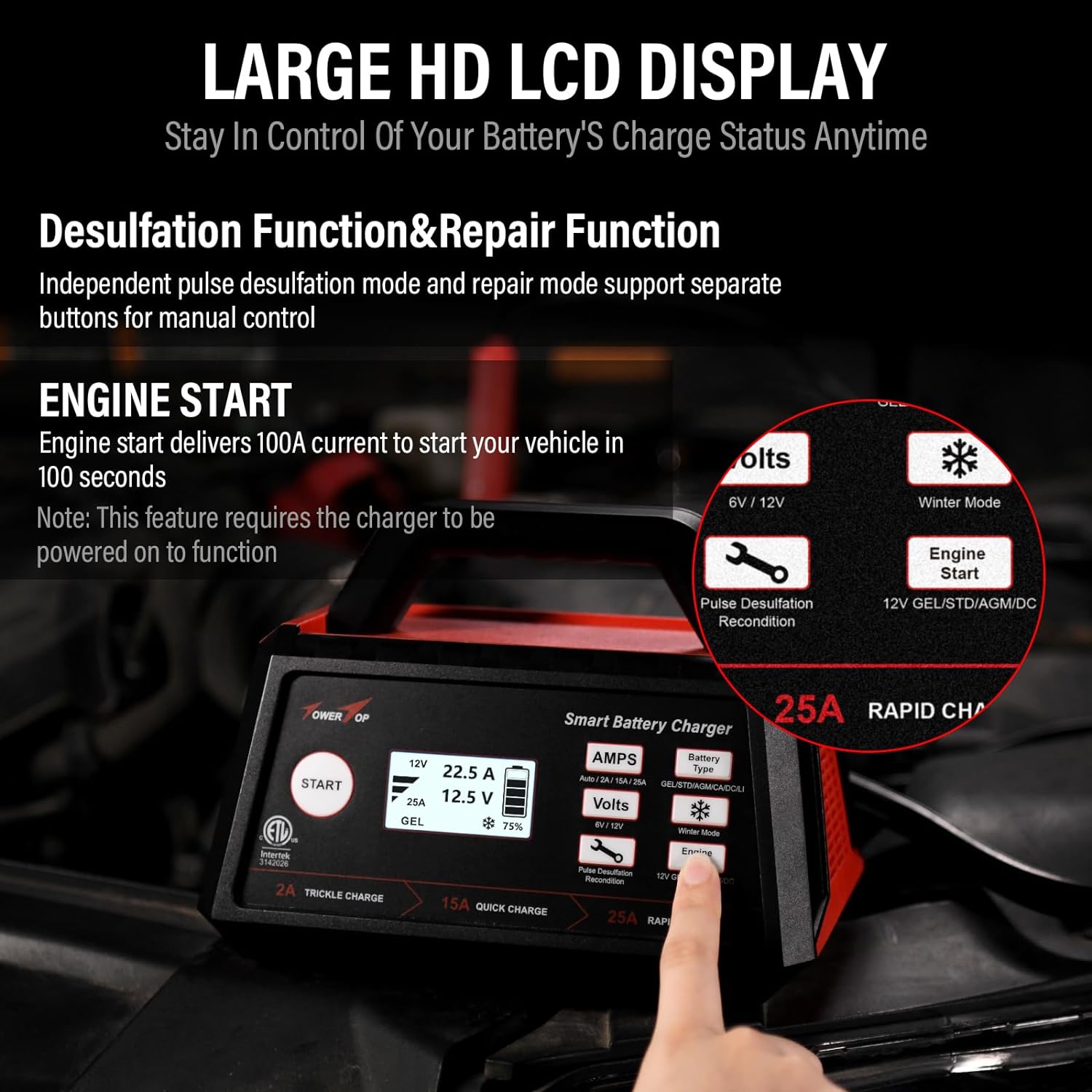 - Engine Start & Winter Mode: Engine start delivers 100A current helps activating your car battery to start your vehicle in 100 seconds. Winter Mode, +0.2v on the basis of the original charging voltage, better boosts your battery activity and charges more thoroughly in low-temperature situations.