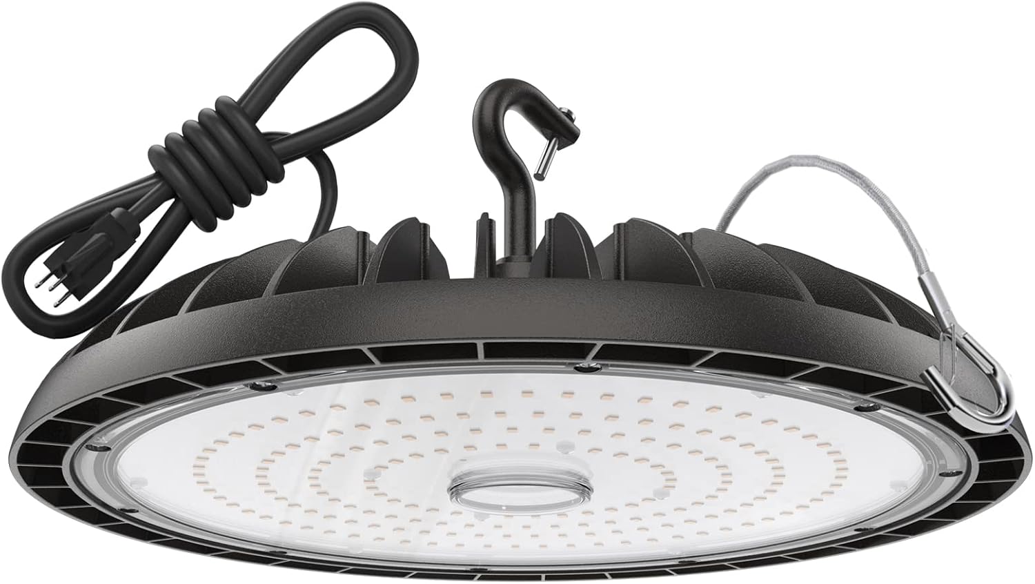 - Fast and Secure Installation: This ETL listed ufo high bay light comes with a hanging hook and safety rope to make it easy to install securely. A US plug with 5 ft power cord is also in the package so that you can plug and play directly. Very time-saving and effort-reducing.