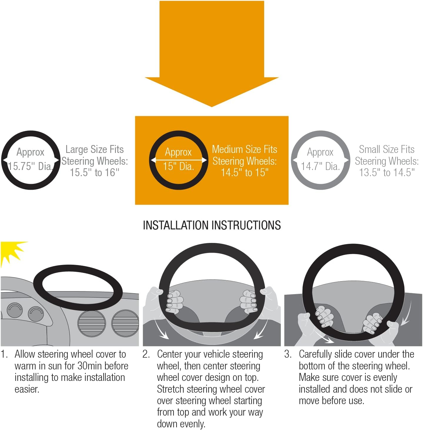 - UNIVERSAL DESIGN - Fits most standard size steering wheels for Cars, Mid-Size Trucks, Compact SUVs and Mini Vans; Fits steering wheels with a diameter of 14.5" to 15"