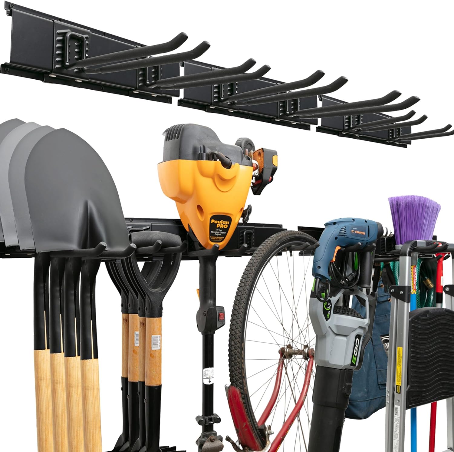 - Customizable Organization: Adjustable hooks with scratchproof sleeves and three rails provide a customizable and modular system that accommodates tools of various sizes and shapes, ensuring a clutter-free storage room.