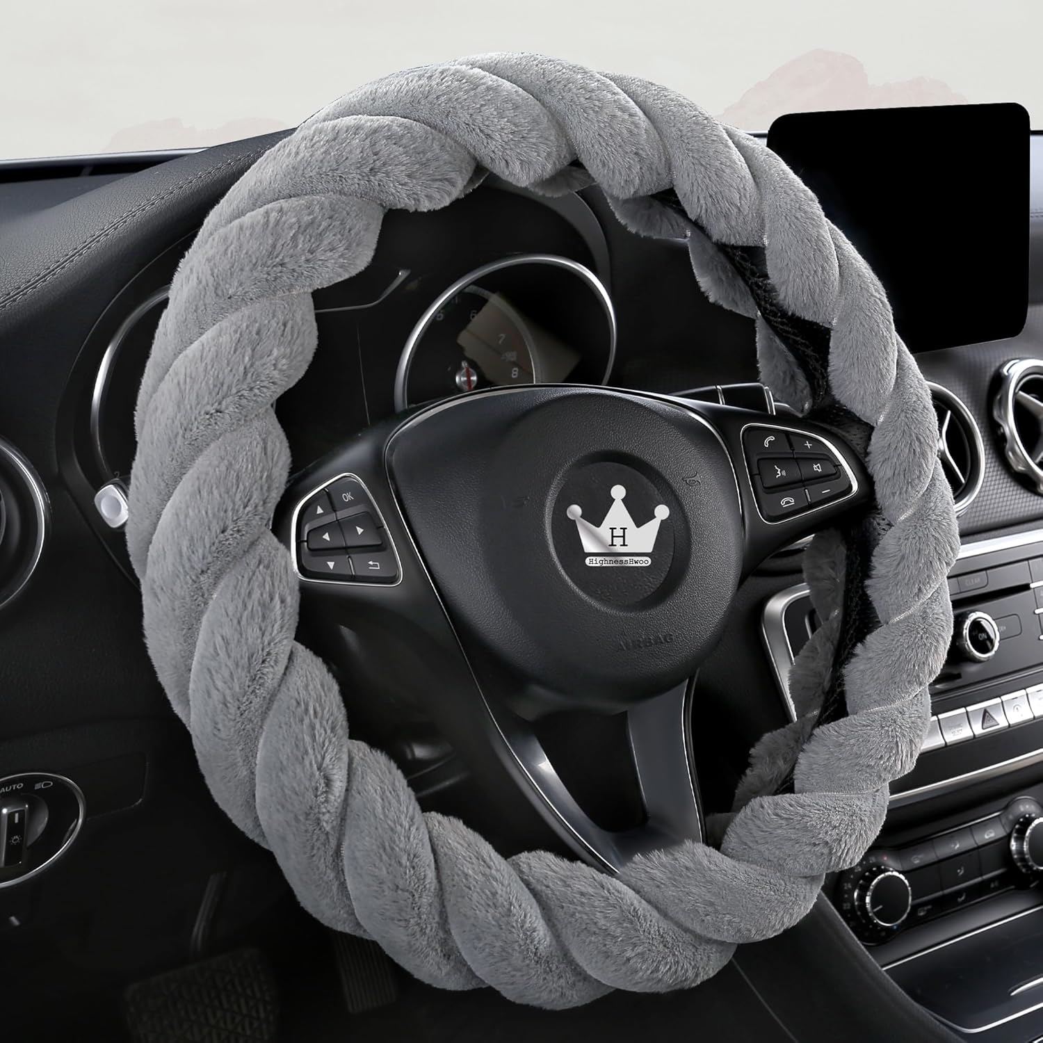 Luxury Fluffy Winter Car Steering Wheel Cover for Women Soft Warm Cute Auto Accessories for Jeep, Truck, Van, F150, Universal, Fuzzy, Anti Slip, Gray, Large Size, 15.2-16in