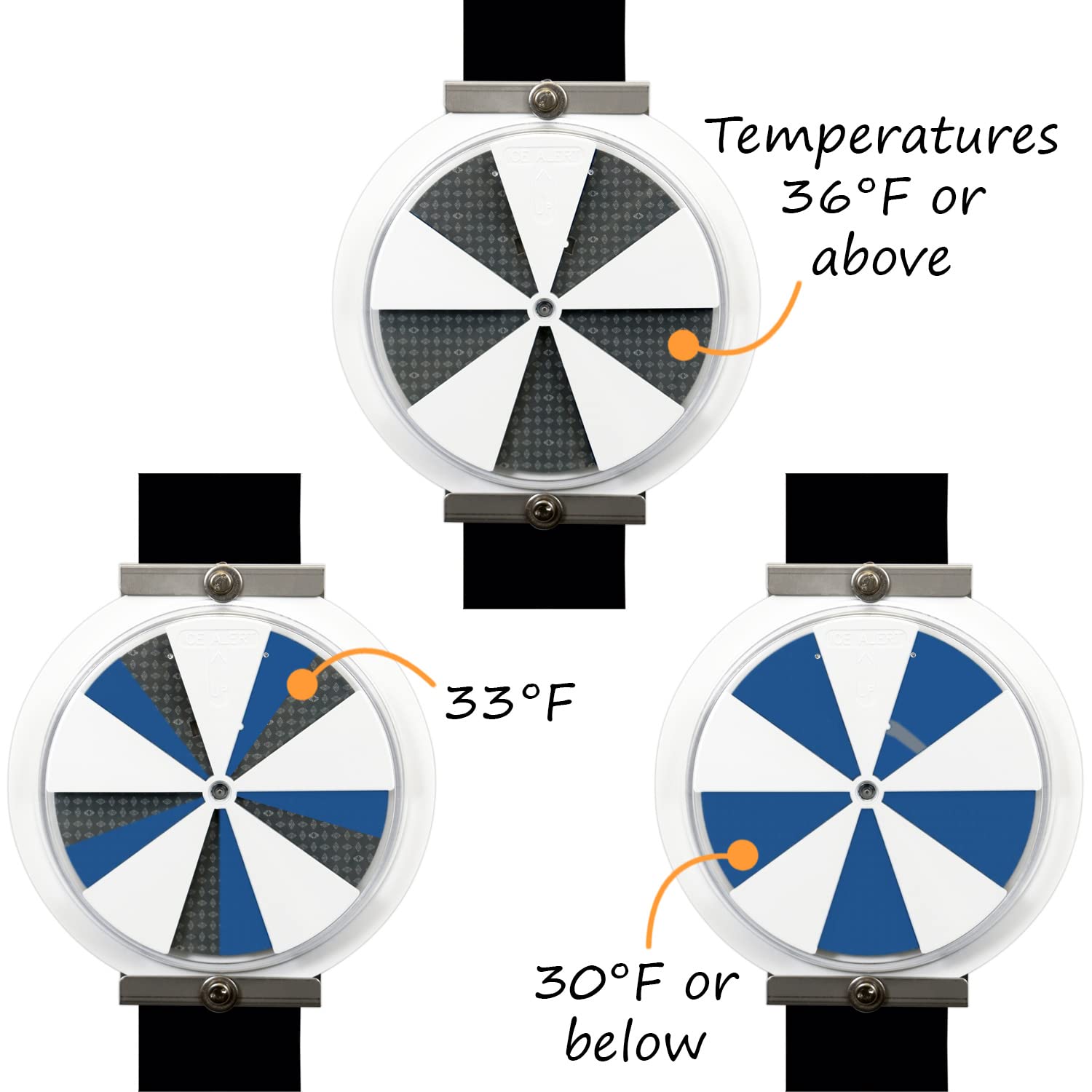 - HASSLE-FREE INDICATOR: Thermostatic bi-metal coil indicator wheel changes from silver to blue signaling freezing temperatures, or the potential for ice. The star pattern design on the waterproof indicator reflects silver at temperature above 37° F. When temperatures are 32° or below it reflects a blue star. Indicator does not require any wiring, electronics, batteries or chemicals.