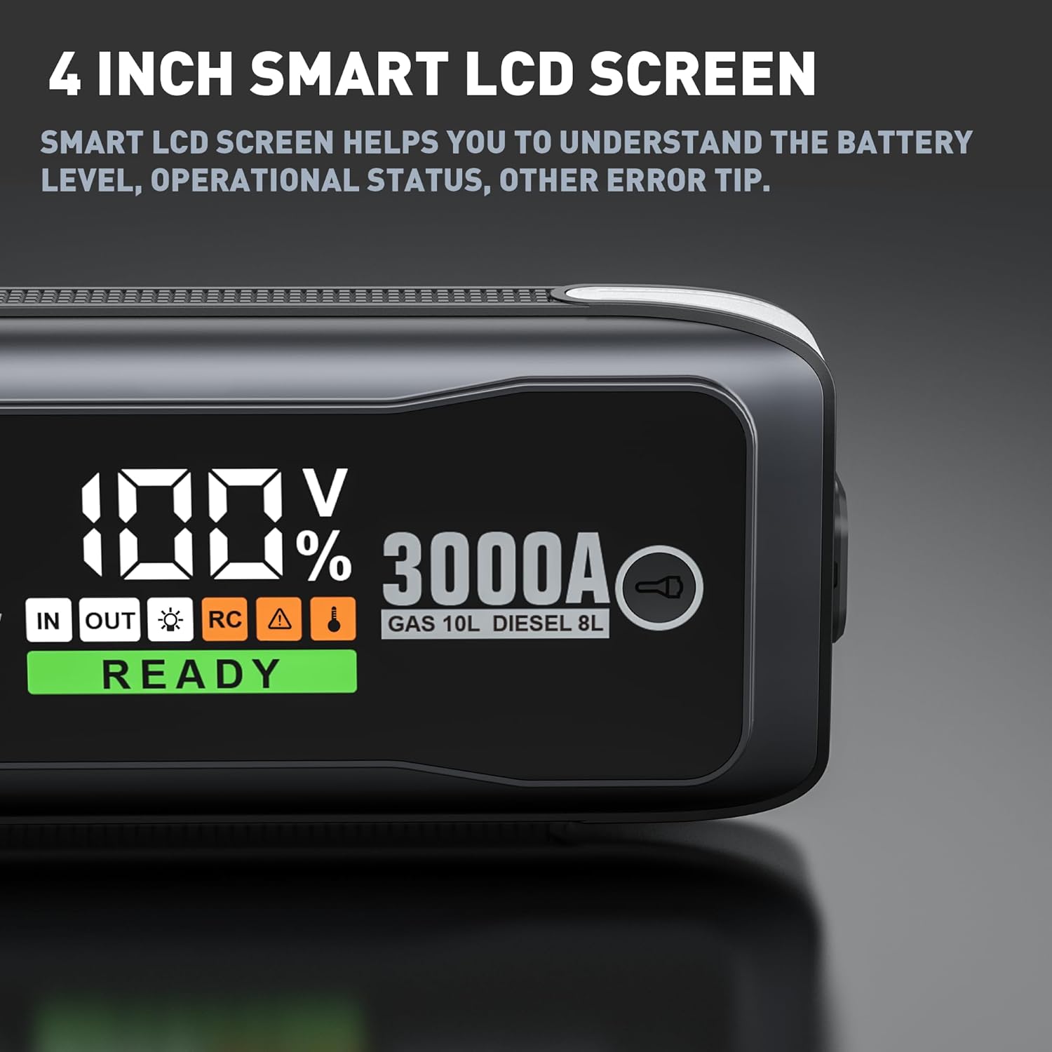 - đă Light You Can Rely OnăEquipped with a 400-lumen LED flashlight and three emergency modesâsteady, strobe, and SOSâthis compact jump starter ensures visibility in roadside emergencies and outdoor conditions. One-button control makes it easy to operate, while the LCD screen keeps power status clear. A true emergency jump starter with light you can count on