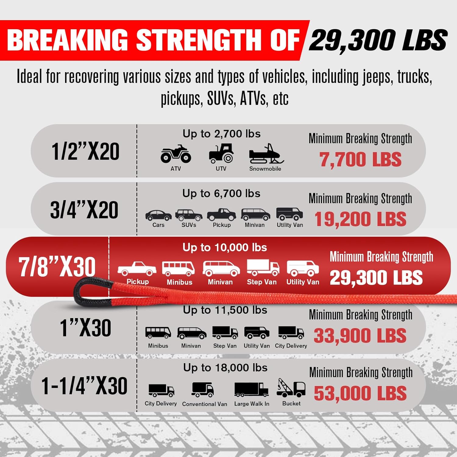 • Superior Toughness: This recovery rope boasts a hefty 29300lbs minimum breaking strength to easily handle your most demanding 4x4 recovery needs. And the double braid nylon tow rope is stronger yet lighter than tow chain of equal strength, which makes the recovery rope ideal for off-road emergency to safely recover and tow your stuck ATV, UTV, snowmobile or SUV out of mud, sand, snow or ditch