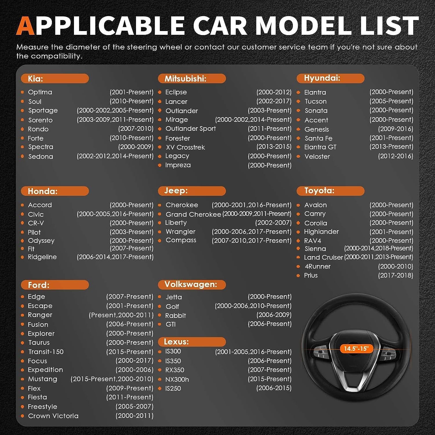 - WIDE APPLICATION: Featuring a universal size, HOTOR leather car steering wheel cover suits car steering wheel with a diameter of 14.5 to 15 inch(about 37 to 38cm). It's applicable to most cars like sedans, SUVs, and RVs.