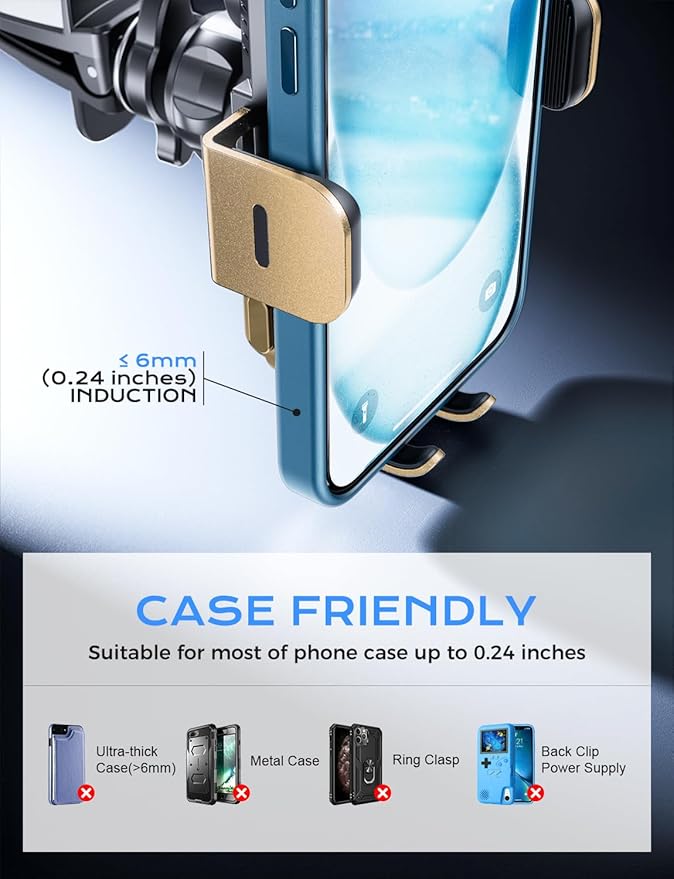 - 【Intelligent Identification & Smart Charging】Experience effortless and safe driving with our phone car mount. It automatically clamps your phone when connected, providing convenience and enhanced safety. The charger's arms open with a simple touch on the 2 sides button. Plus, it intelligently powers off and protects your phone's battery when it's fully charged.