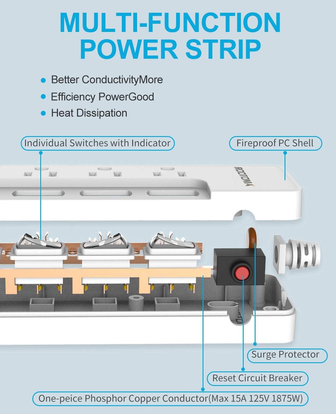 - 【One-Piece Copper Sheet & Fire-resistant case】This 15A/1875W/125V multi plug outlet is high-quality made with PC Fire Resisted material and the advanced One-piece 100% Copper Bar. Compared with other traditional copper conductor, it has lower heat dissipation, better conductivity and provides more efficient power and safty for all your appliances.