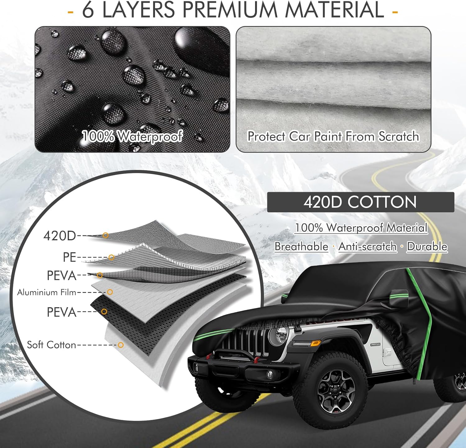 - đăPremium MaterialăThe car cover for 2004-2006 Jeep LJ is made of heavy-duty 420D Oxford cloth and waterproof silver-plated fabric, and has cotton coating, which can be windproof, rainproof, dustproof, UV-proof, sun-proof, anti-corrosion, not easy to tear, and withstand water pressure up to 2000mm. The inner layer also has a thickened cotton backing, which not only prevents the paint from being scratched, but also has thermal insulation, which is warm in winter and cool in summer.