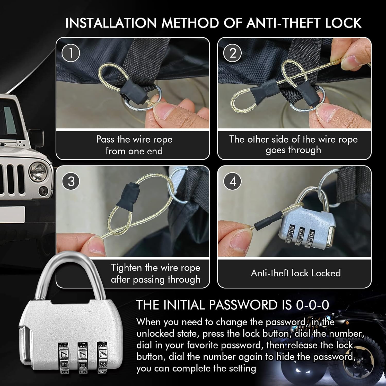 - đăUpgrade Windproof Designăâ A windproof fixed buckle pass through the middle of the car for easy fixing; âĄ2 windproof belts at the front and rear; â˘4 straps to tie the cover to the four wheels; âŁElastic band at the bottom can easily adjust the size of the cover; â¤Double stitching ensures that the cover will not tear easily, making it more durable; âĽThe included safety latch secures the cover. Multiple upgraded designs keep your protective cover from being blown away even in strong winds.