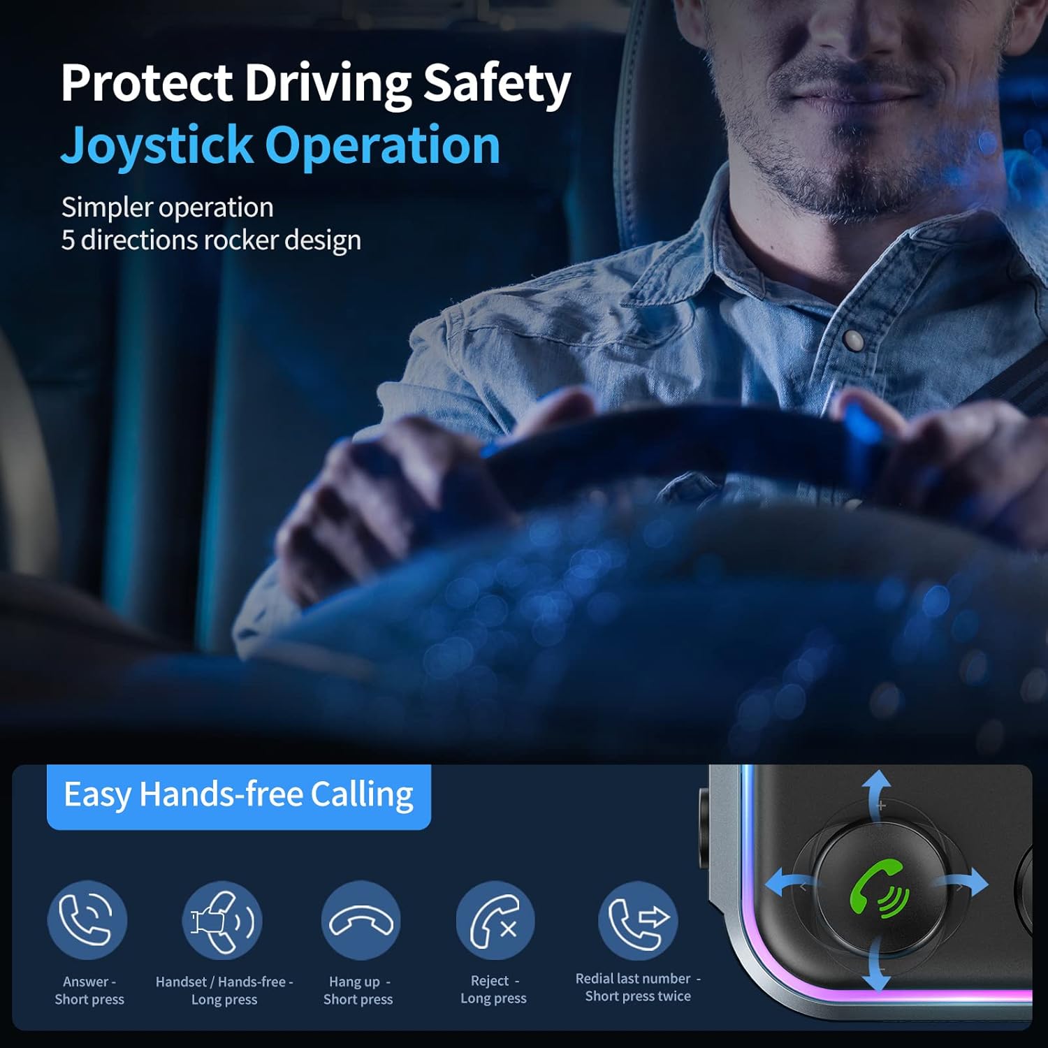 - â ăSecure Joystick Design & Hands-Free CallingăThis fm transmitter selects user-friendly analog joystick controller, superior to competitor' usual rotary switch, which simplifies the whole operation by simply pulling the stick, saving the trouble. Hands free function ensuring driving safety, answer/reject/hand up/recall all in One key.
