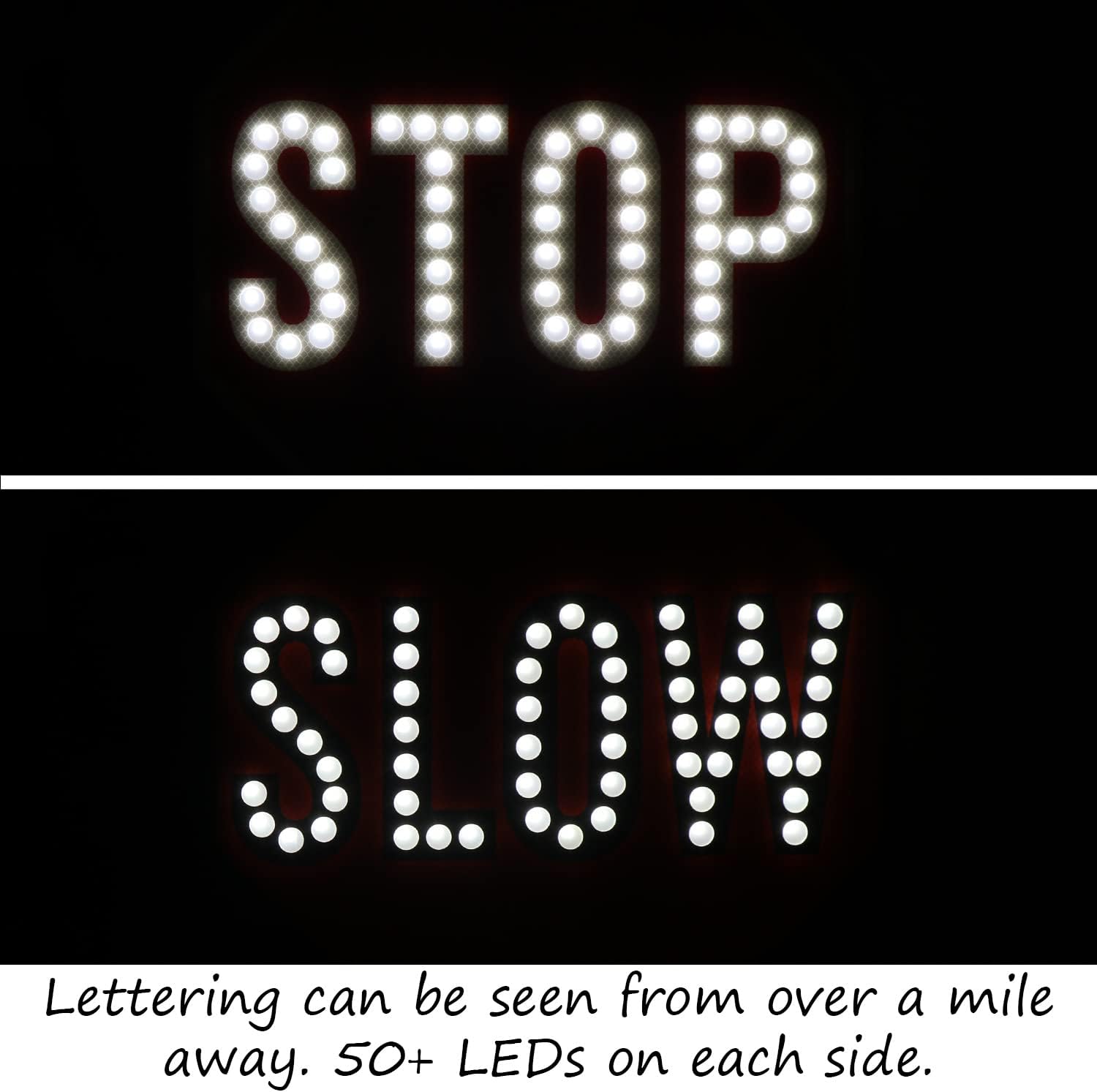 - HARD TO MISS: Each sign face has LED lights within the STOP text. With 52 and 58 LED bulbs per side resp., the sign is visible over 1 mile away. Text height is 8". Now you can keep traffic in control easily.