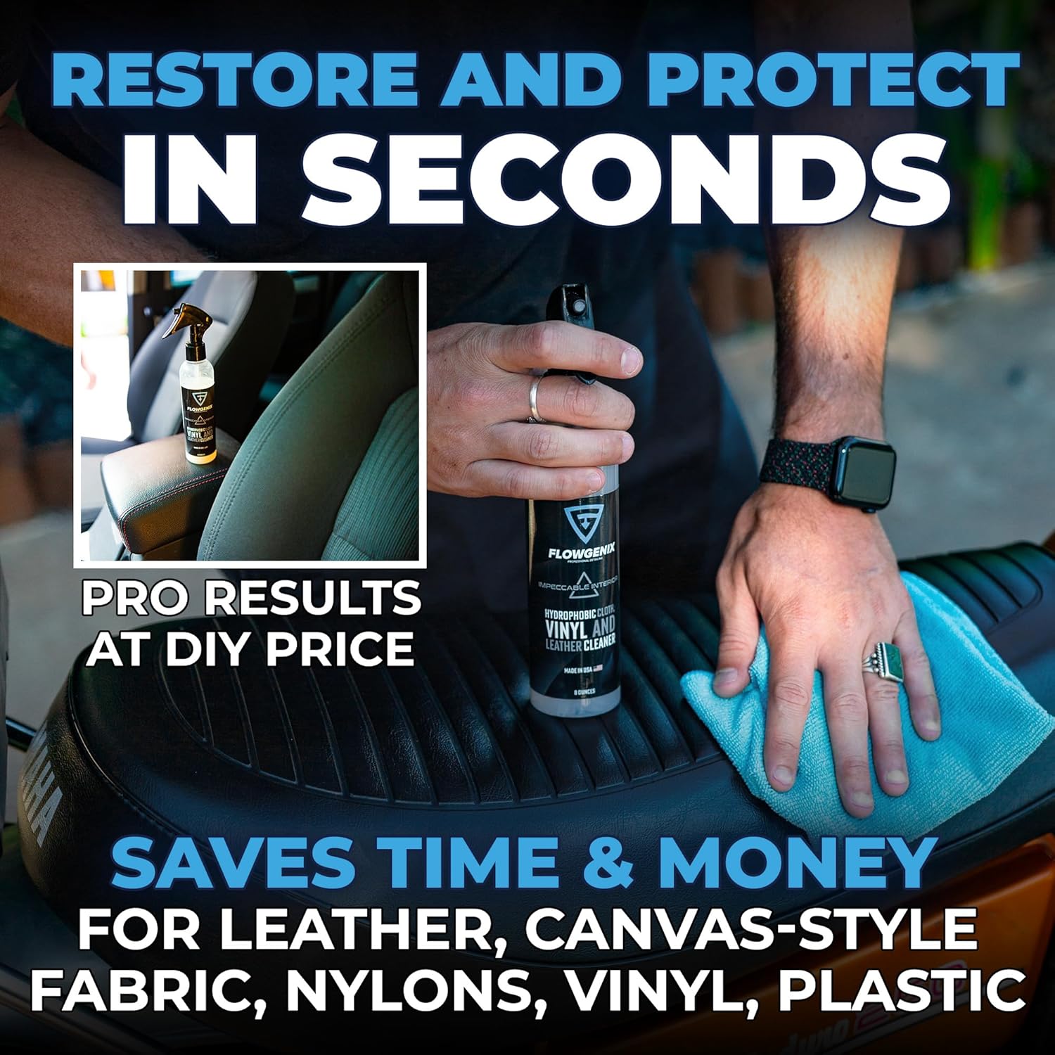 - ✅ INTERIOR PROTECTION: Flowgenix Impeccable interior car cleaner adds a protective coating that will repel water, stains and scratches from your leather, canvas-style fabric, nylons, or vinyl. Comes with 2 complementary edgeless Premium Microfiber Towels (380 GSM, 16x16 inch) for safe and effective detailing application, and drying.