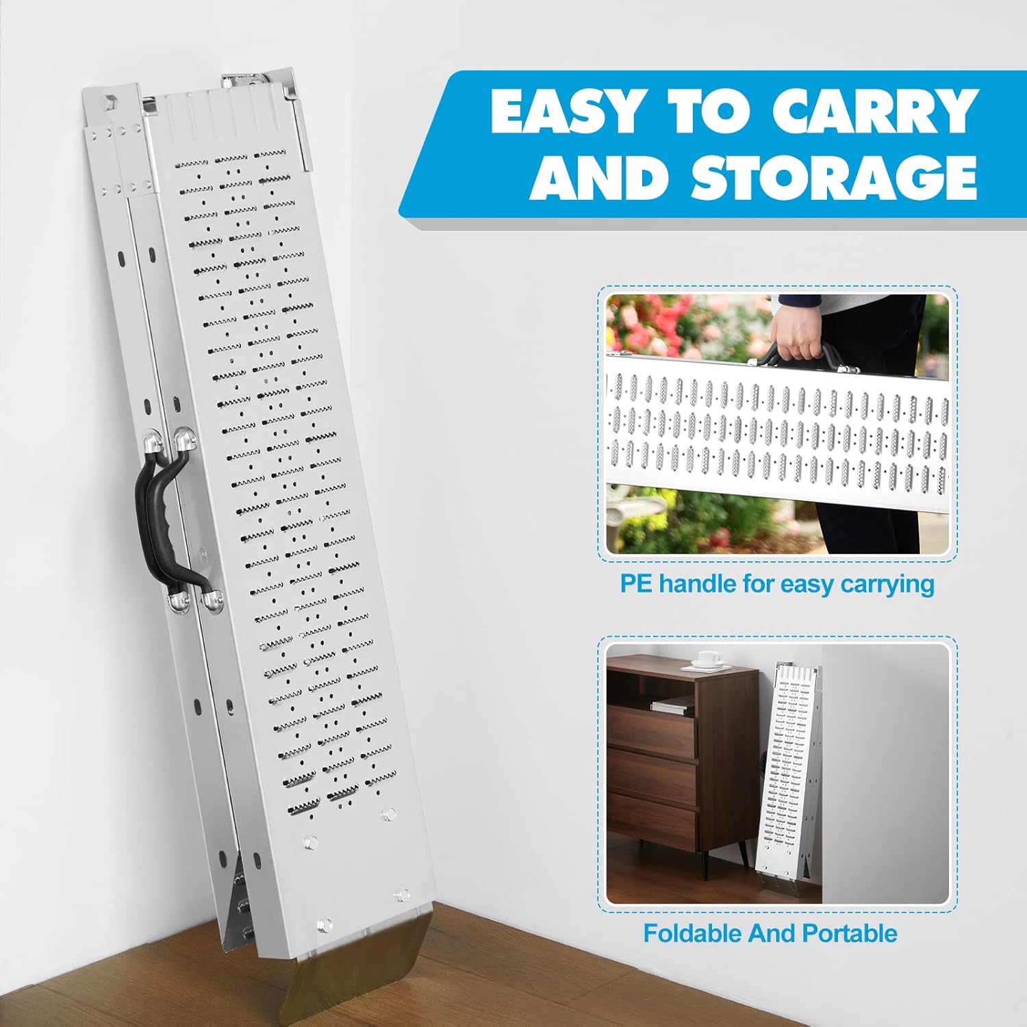 - 【Motorcycle Ramp-Foldable and Portable】: The net weight of each loading ramps for pickup trucks rampas para levantar carros is only 11.4 lbs.There is a plastic handle on the side, making it easier to carry. This design allows easy placement of shed ramp in corners of rooms and in the trunk of cars, saving storage space.Unfolded size: 78.7"L x 8.6"W x 3.5"H. Folded size: 39.4"L x 8.6"W x 3.4"H