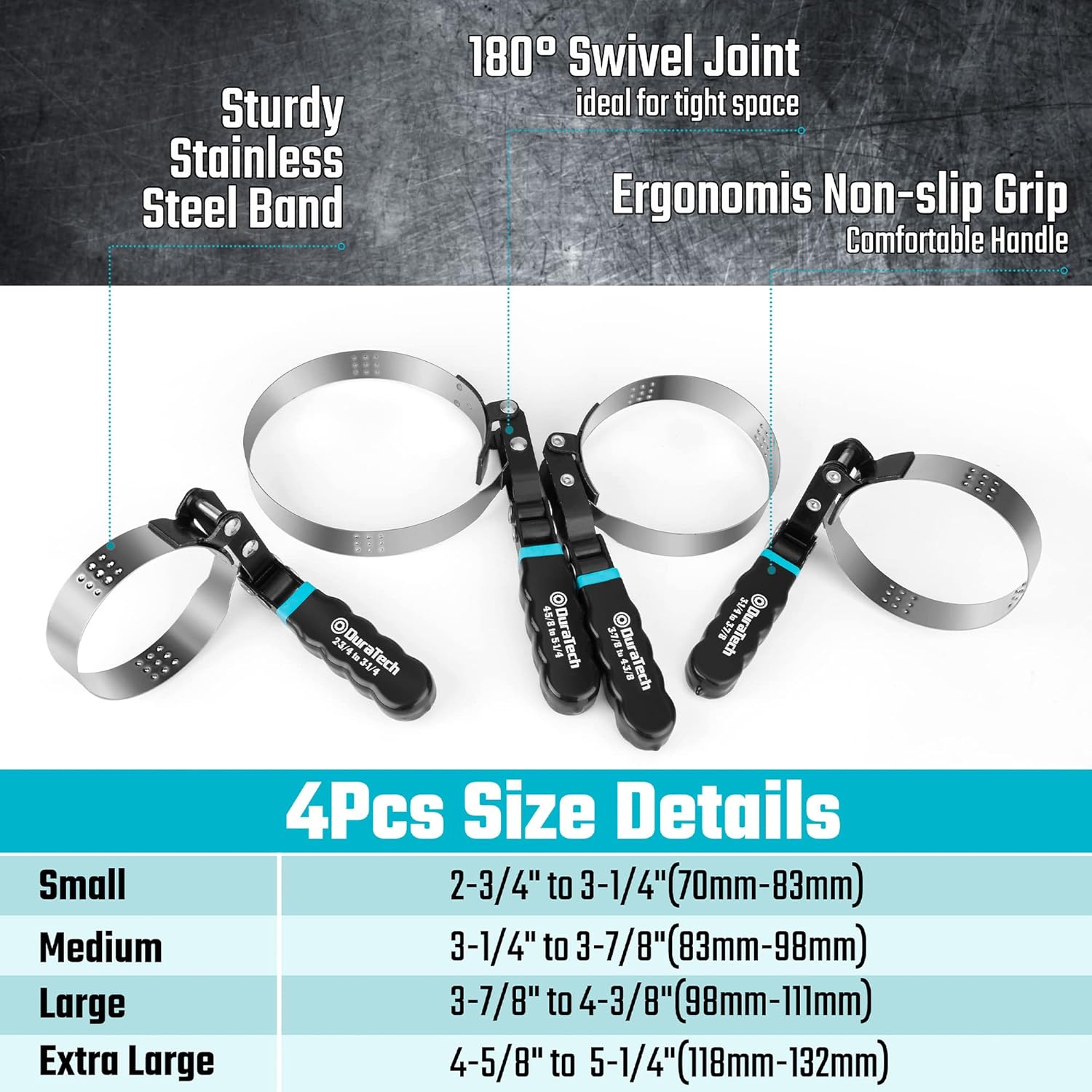 - 4 Size Oil Filter Wrenches: Swivel Oil Filter Wrench set includes a small 2-3/4 "to 3-1/4 " (70 mm-83 mm), medium 3-1/4 " to 3-7/8 " (83 mm-98 mm), large 3-7/8 " to 4-3/8 " (98 mm-111 mm) and extra large 4-5/8 " to 5-1/4 " (118 mm-132 mm). Each 180-degree flexible swivel head makes it easy to turn in tight spaces and keep adjustable tension