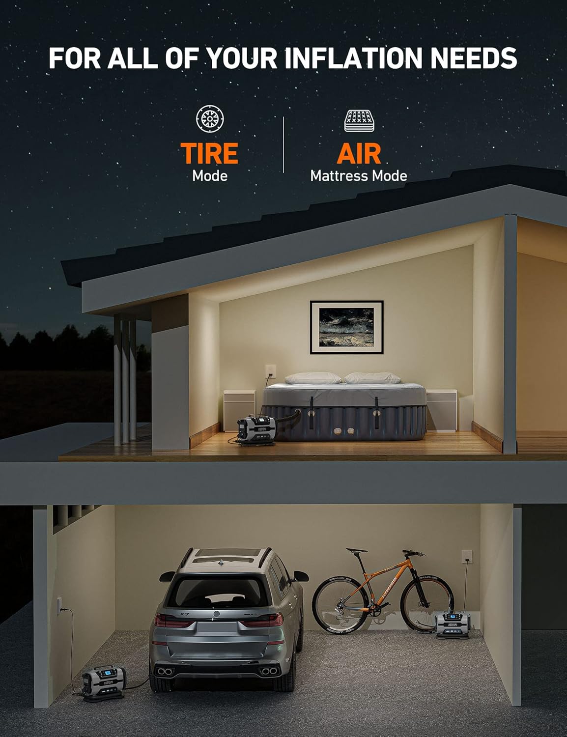 - Tires & Other inflatables: The AstroAI Tire Inflator can easily switch between high-pressure and high-current inflation modes. High-pressure mode inflates car, bicycle and motorcycle tires along with sports equipment and other small inflatables. Large-volume mode inflates bigger low-pressure objects like air mattresses or inflatable rafts.