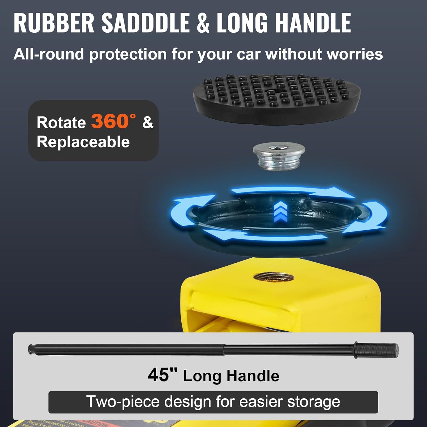 - Secure and Carefree: A rubber saddle provides maximum protection to your vehicle! The 360° rotatable saddle can be detached and replaced. Thanks to the leverage principle, the 45 in/1145 mm long handle makes lifting easier. With the two-piece design, the handle can be disassembled when stored, taking up little storage space.