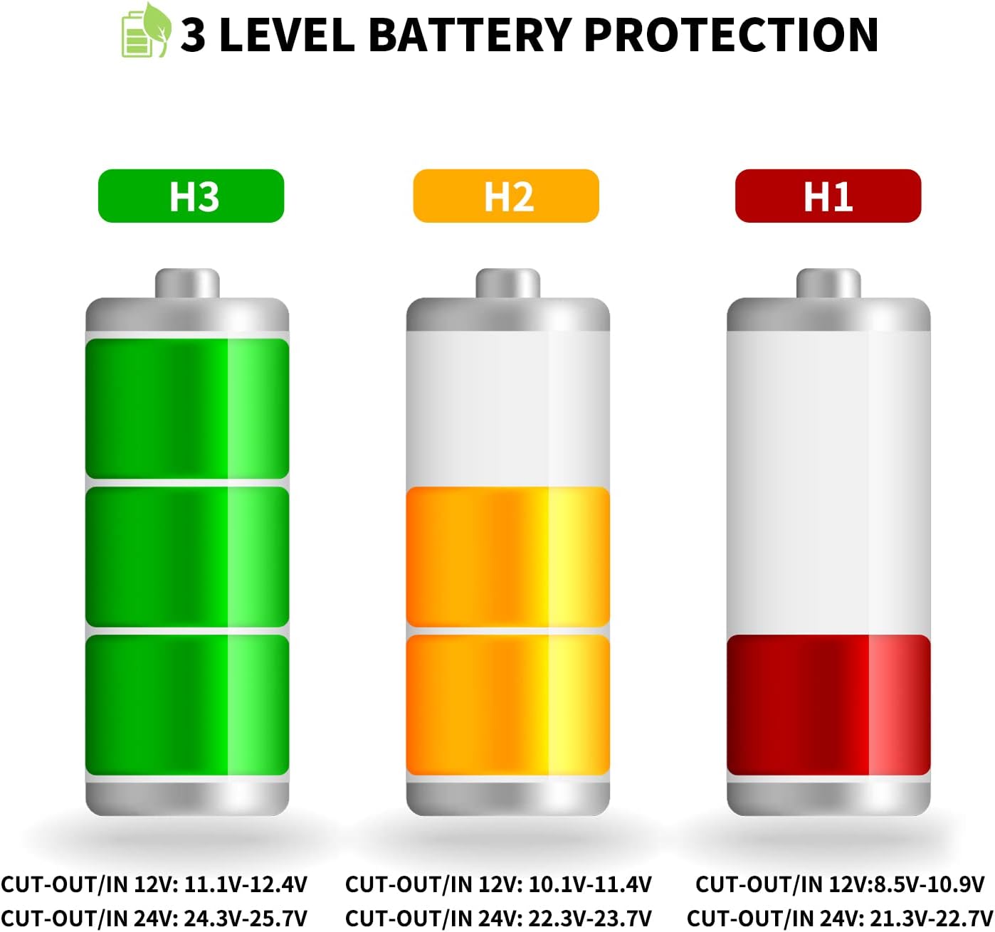 - CAR BATTERY PROTECTION:With temperature memory function and 3 different levels for battery protection: Low(H1), Med(H2) and High(H3) to protect your vehicle battery without run down.