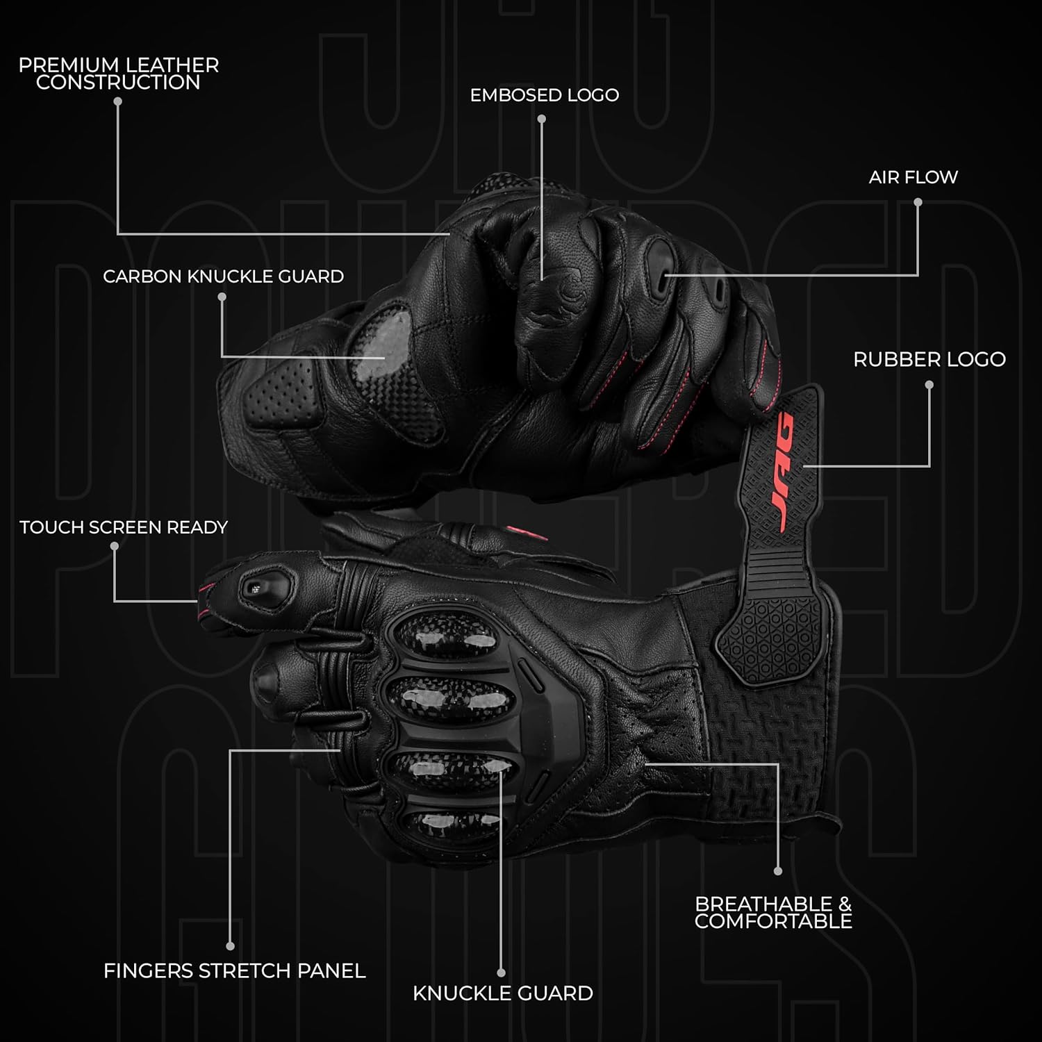 J.A.G. Leather Motorcycle Gloves for Men - Carbon Fiber Knuckle Protection, Motorbike Powersports, Dirt Bike, Touchscreen Gloves for Men and Women, Guantes para Moto.