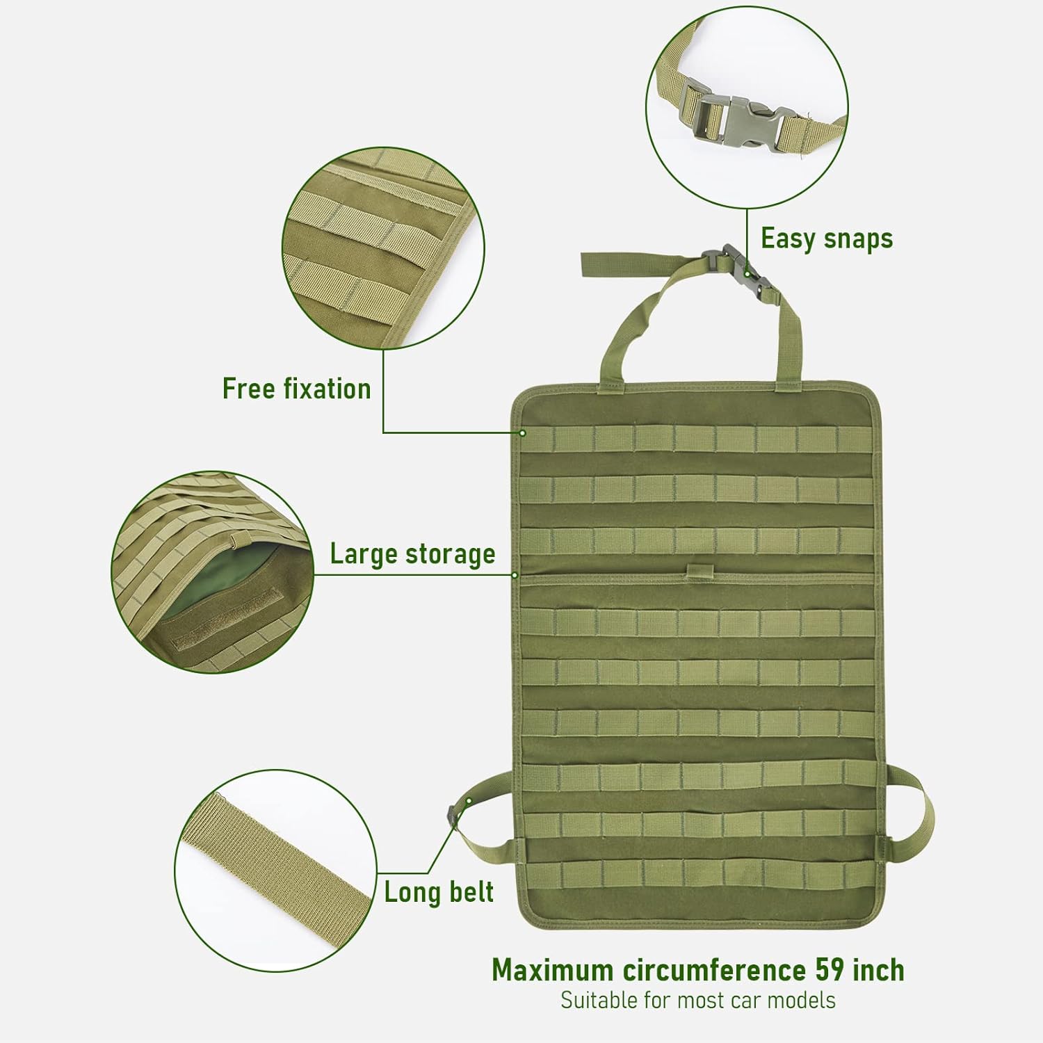 - 🚗 Multifunctional Storage - Design with 5 Molle bags on the back to help you store tactical gear & personal items and save space. Difference sizes of Molle bags help you classify your items so easily.you can set the Tactical Seat Back Organizer according to your own habits and need.