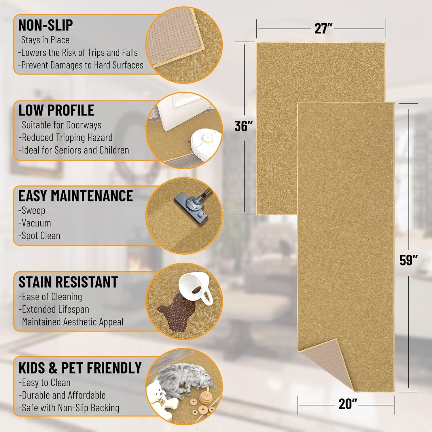- [KEY ATTRIBUTES]: Size: 20" x 59" (2' x 5') + 2'3" x 3' (2' x 3') | Thickness: 0.2 in. | Color: Beige