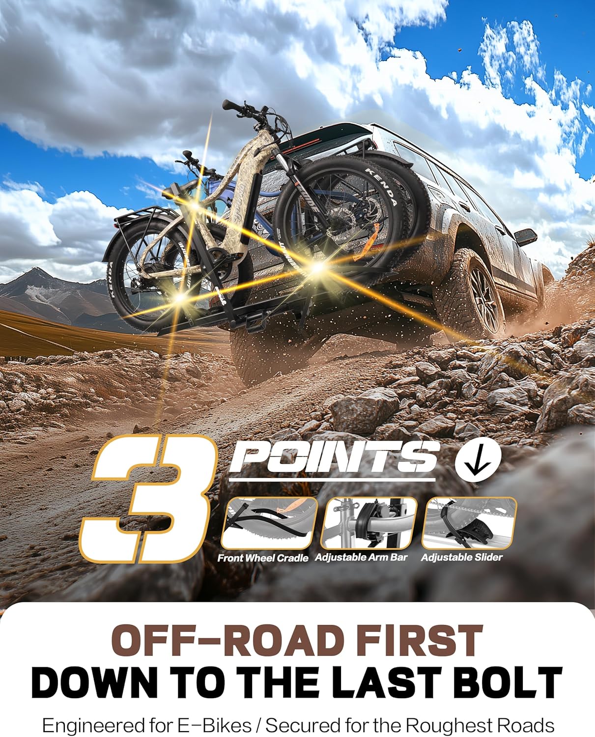 - SAFE AND SECURE ON OFFROAD: Comes with 2-arm fix, Anti-falloff 360° swirl structure and anti-wobble structure, that secure your E-bikes in place without swaying and knocking against vehicle.