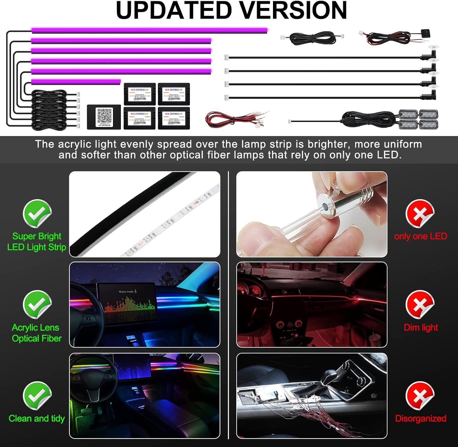 - 【High Bright & Uniform】The RGB Acrylic Ambient Light Strip have super bright LED and acrylic lens and contains 6 LED strips (4 x 29.5 inches + 1 x 43.3 inches + 1 x 14 inches), Foot well lamp*4(44.5inch*2/64.2inch*2) and Door handle light*4, also comes with 1 main controller and 4 sub controllers,and can be flexibly installed on any car by DIY without disorganized, which is plug and play, and and this acrylic light evenly spread over the lamp strip is brighter, more uniform and softer than other optical fiber lamps that rely on only one LED.