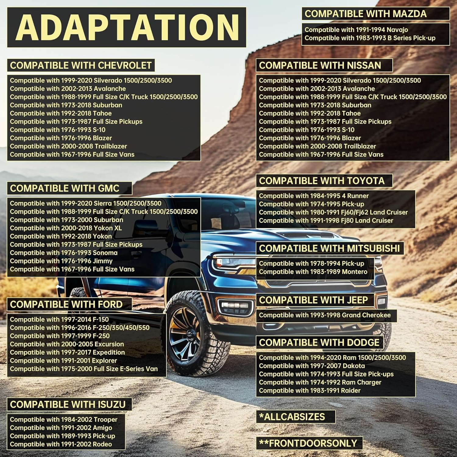 - Fitment1: Compatible with 1967-2020 Chevrolet Silverado Avalanche Suburban Tahoe S-10 Blazer Trailblazer Full Size C/K Truck Vans; Compatible with 1967-2020 GMC Sierra Suburban Yokon XL Sonoma Jimmy Full Size C/K Truck Vans; Compatible with 1975-2017 Ford F150 F250 F350 F450 F550 Excursion Expedition Explorer Full Size E-Series Van; Compatible with 1974-2020 Dodge RAM Dakota Charger Raider Full Size Pick-ups