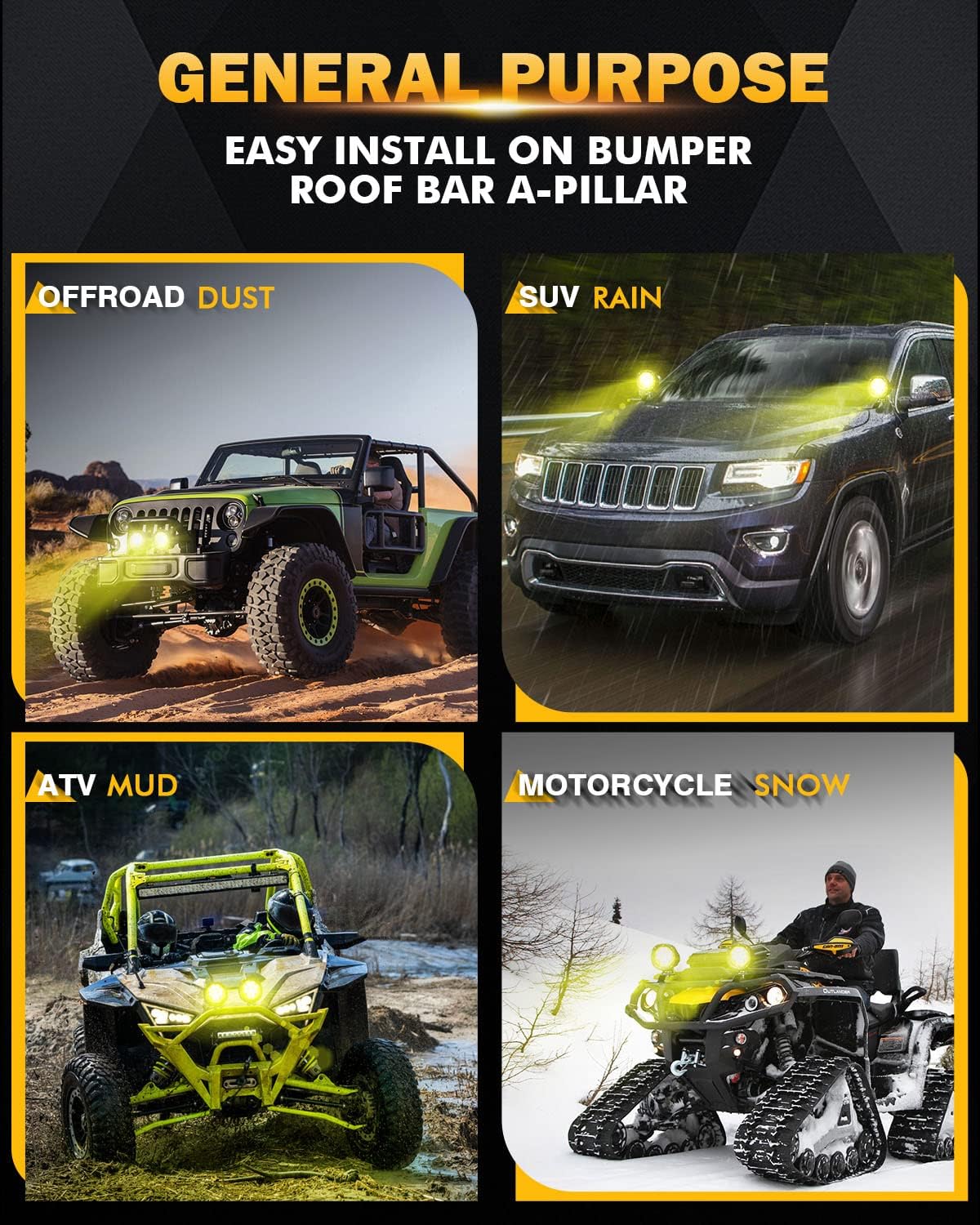- [BUILT-IN EMC & WIDE ADAPTABILITY] - Utilizing the latest technology to better protect the internal electronic components in lighting and external objects like a radio receiver. Amber driving lights are perfect for 9-32V vehicles and can be mounted in various locations, including on a roof rack, A-pillar, bumper, or grille guard.