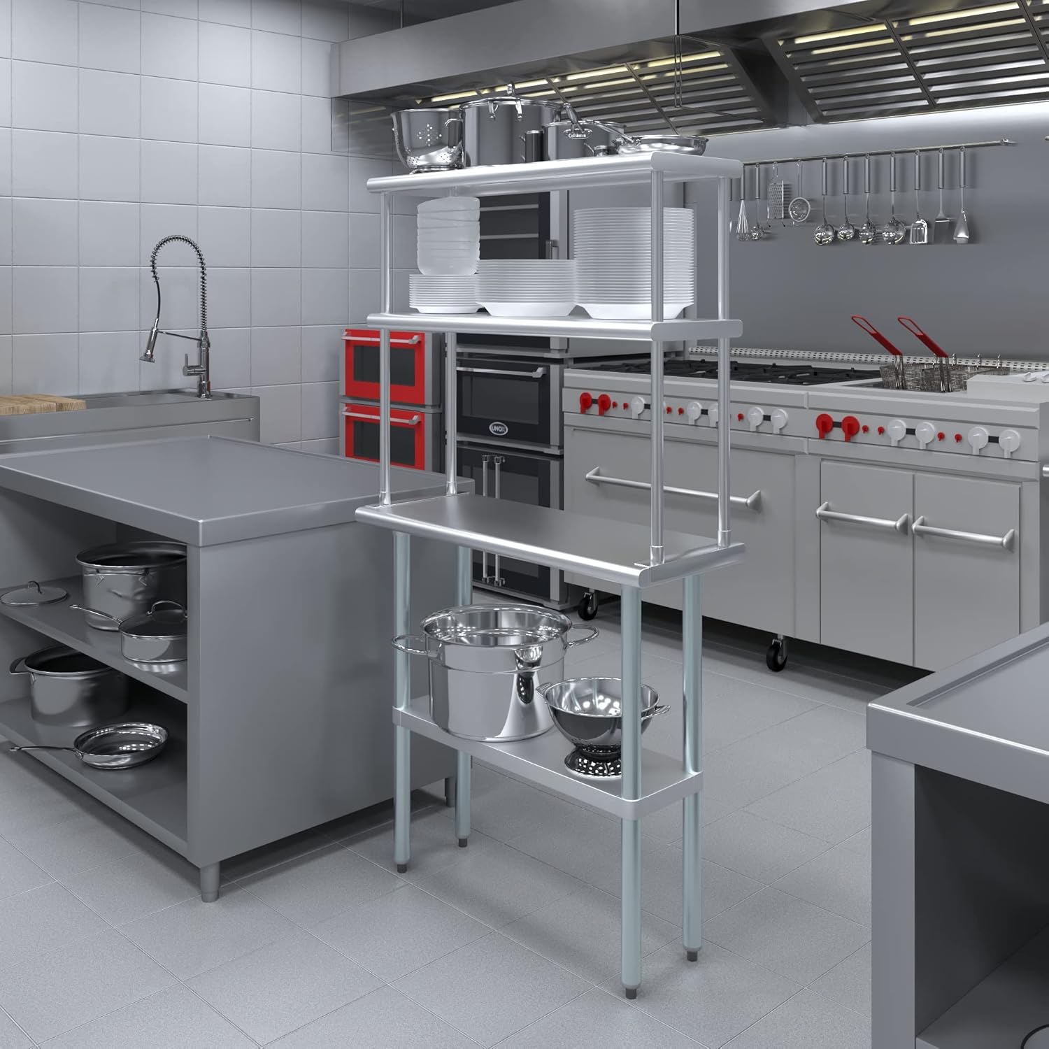 - WORK SAFETY: Work table top and double tier adjustable shelves are constructed from 18-gauge stainless steel, making this restaurant prep and serve table and double tier shelf combo set is durable and long lasting. The table top comes with a galvanized under-shelf for additional storage and adjustable legs for convenience. This table and shelf set is specifically designed and finished for use in a commercial or industrial setting, but is just as reliable in the home.