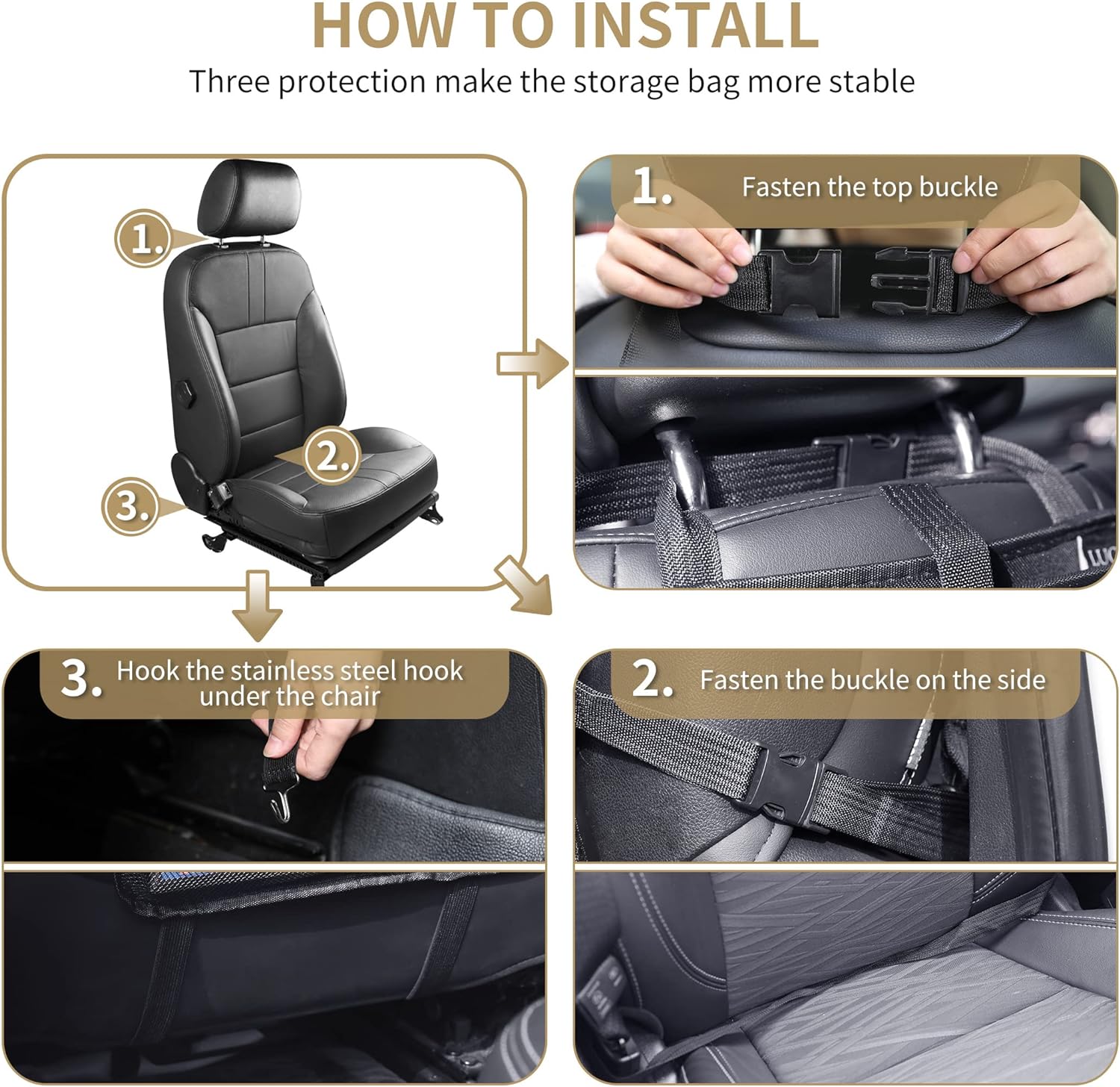 - 【High Quality Material】LUCMO car seat storage bag is made of high quality material, with perfect waterproof performance and good durability. Makes your car look luxurious! Plus, it protects the back of your car seat from dirt, scuffs, and kick stains.