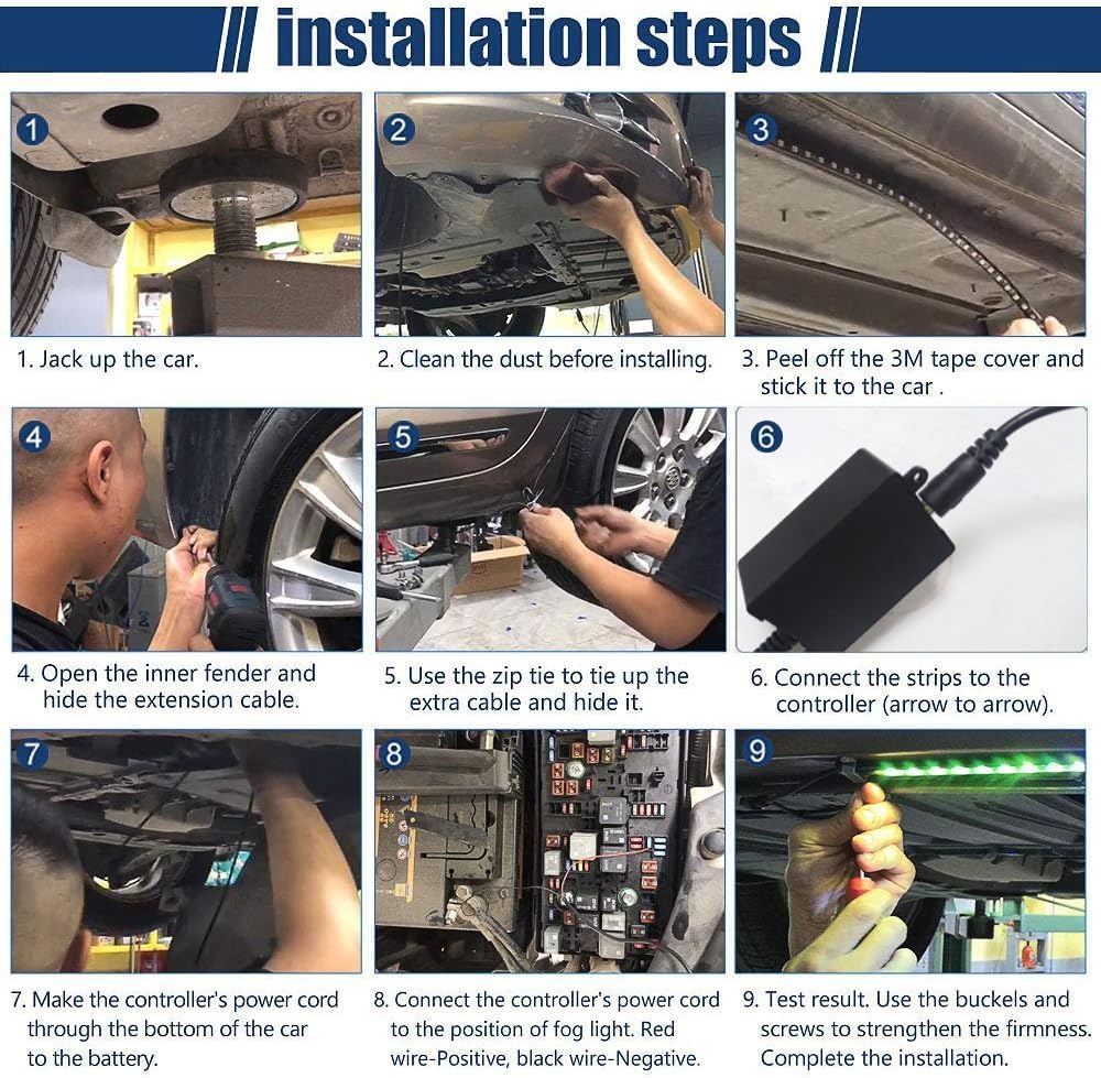 - 🚗【Easy Installation & Safe to use】You can power the strip lights by the 12V cigarette adapter or by Positive/Negative wiring. Simply peel off the self-adhesive tape of the under car light and stick to the dry, clean, flat surface. Also come with buckles and screws to install the strip lights under the car very sturdy. The tube is soft and flexible and can be bent at will.