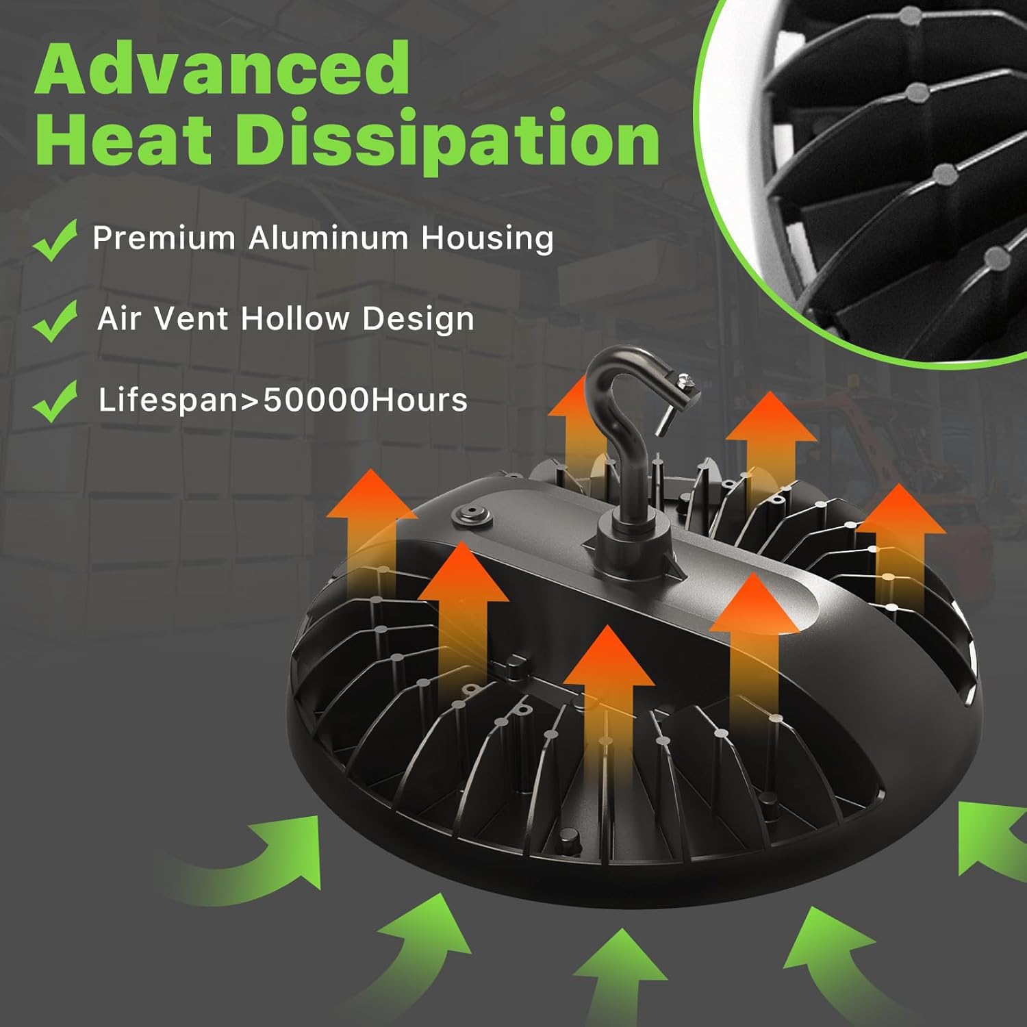 - Premium and Durable: Made of high quality aluminum material, this ufo led high bay light is solid and durable. Air vent hollow design and high cooling fin bring up advanced heat dissipation, which ensures its lifespan up to 50000hours.