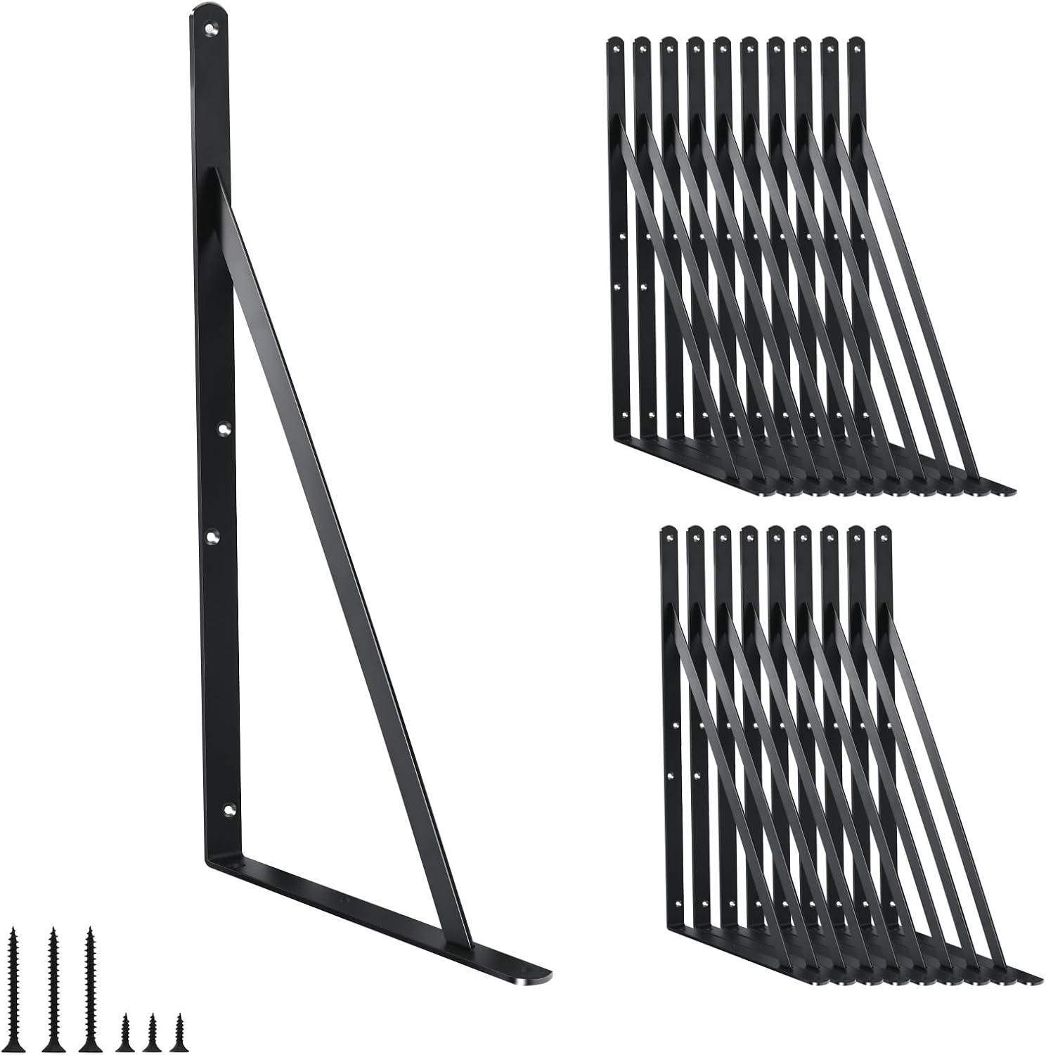 - Size:L 16" x H 10" x W 1", 3mm Thick. Package included: 20 x Brackets , 60 x long Screws, 80 x short Screws(Wood plank is Not included)Our floating shelf brackets come with 20 brackets for your wall mounted shelves.Our heavy-duty brackets can support Audio Equipment,bookshelf,kitchen ware,electric power tools , TV bench ,farm tools,etc