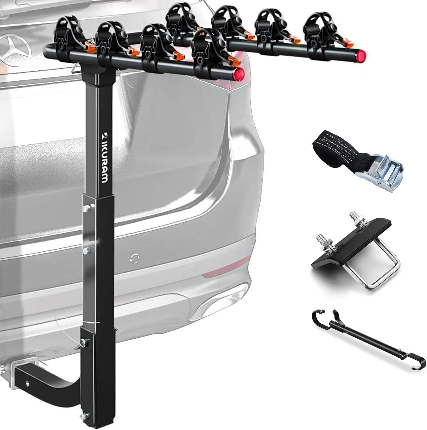 4 Bike Rack Bicycle Carrier Racks Hitch Mount Double Foldable Rack for Cars Truck SUV Fits 2" Receiver, Tie Down Strap, Anti-Rattle Hitch Tightener & Bicycle Cross-bar Adapter for Kid’s Bike