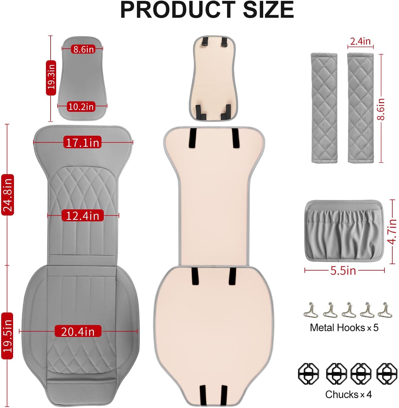- Package Includes:car seat cover*2, car pocket organizer*1,car seat belt pad*2,metal hook*5, chuck*4,installation manual*1.Please contact us if you have any questions about the product, and we will reply you within 24 hours.