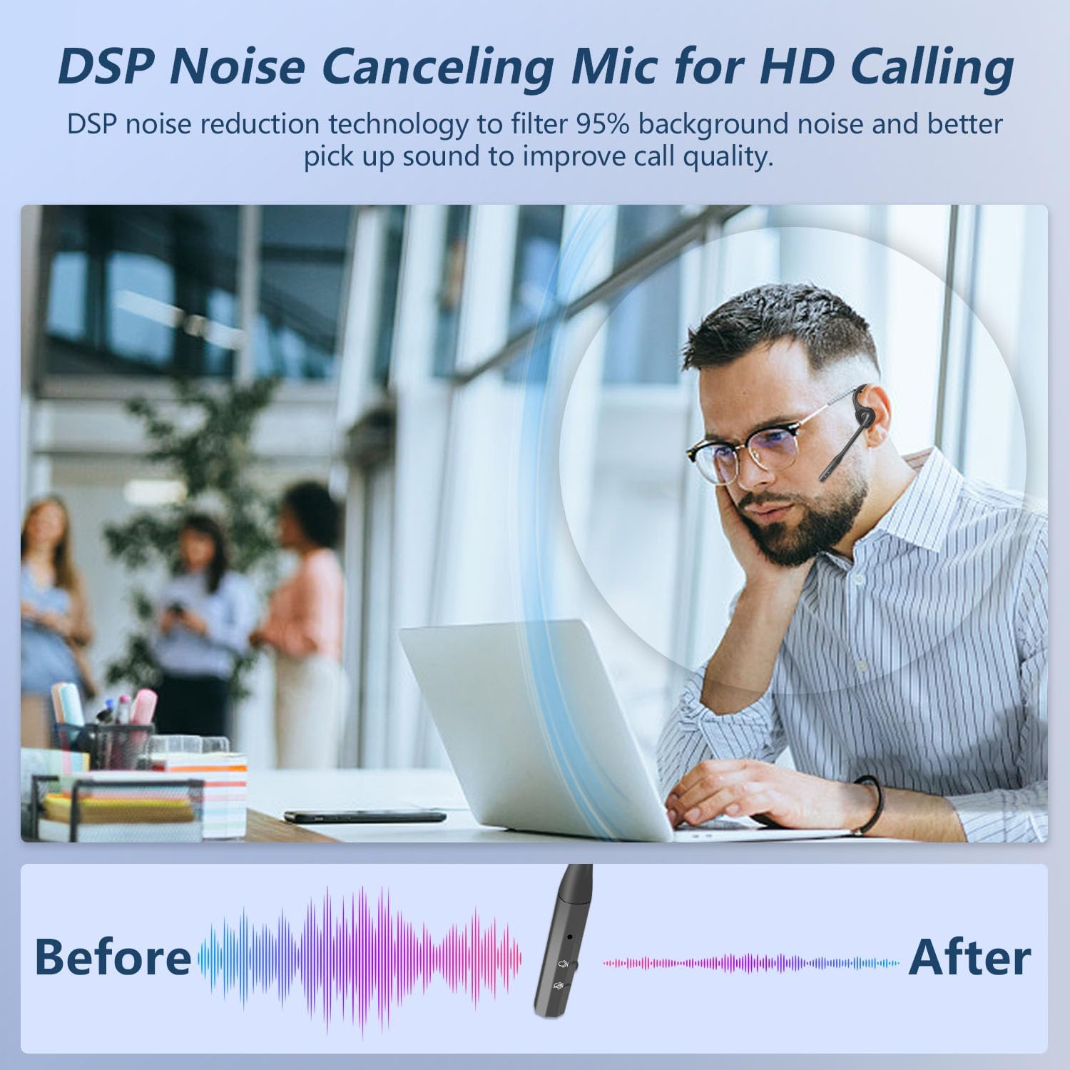 - [Dual Noise-Canceling Mic for HD Calls] Bluetooth earbuds equipped dual noise-canceling microphone with DSP noise reduction technology ensures clear calls and a great music experience. The flexible boom can be rotated 240° to adjust to the best position to better pick up your voice and improve call quality. In addition, Bluetooth headset with microphone has Φ16.2mm driver speaker, it is the bigger than others and the sound will be more clear and louder.