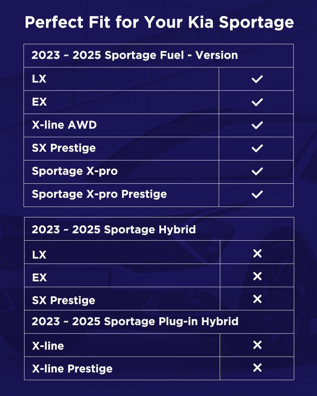 - Custom Fit for Kia Sportage: (Not compatible with PHEV & Hybrid models) This 4-piece set designed to fit 2023 2024 2025 2026 Sportage, includes tailored mats for the front row, rear row, and cargo area.(Fits with Standard Audio System and cut to fit Optional Bose Audio System) Clean lines and precise cuts ensure a tight, seamless fit—even with the optional Bose audio system