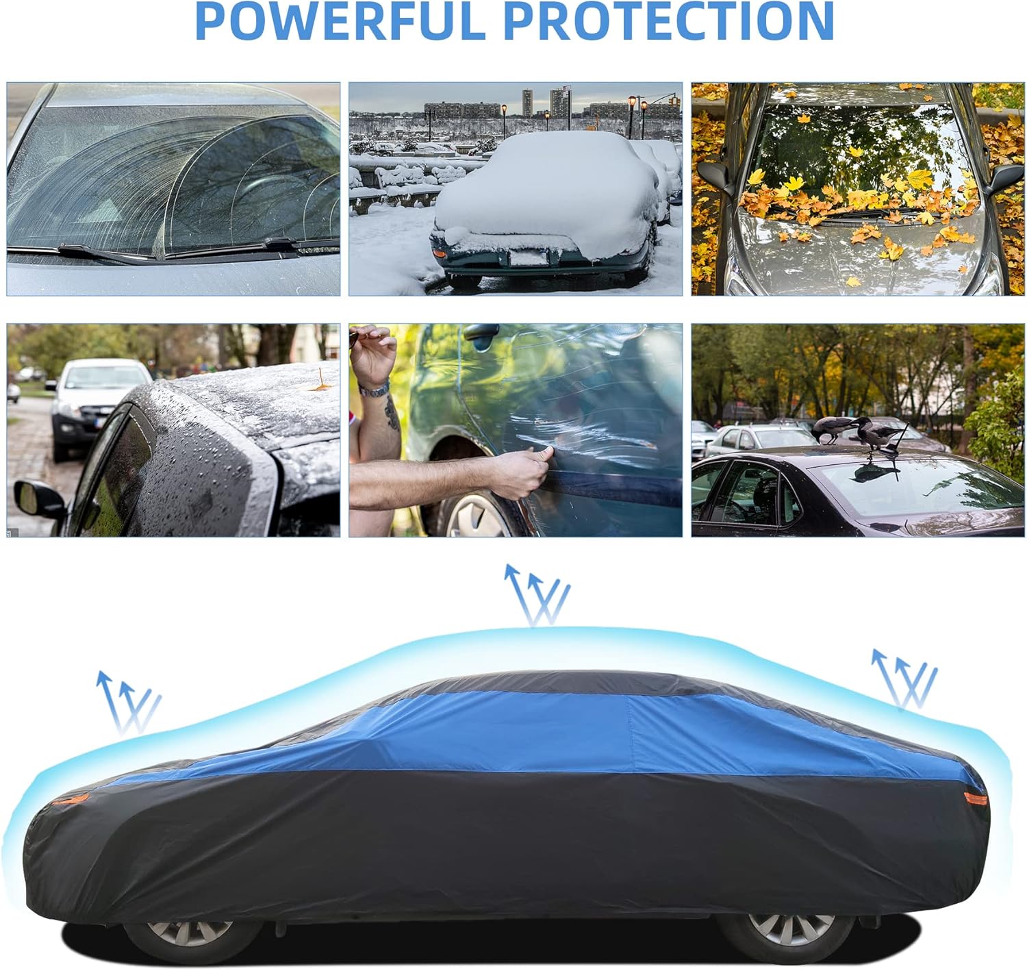 - 【All weather protection】The XicBoom full car cover provides all-round protection for your vehicle against sunlight, UV rays, dust, snow, acid rain and fallen leaves, industrial pollution, bird droppings, pollen, animals and extreme weather. Easy to clean, just wipe with a damp towel to remove contaminants from the surface of the cover.